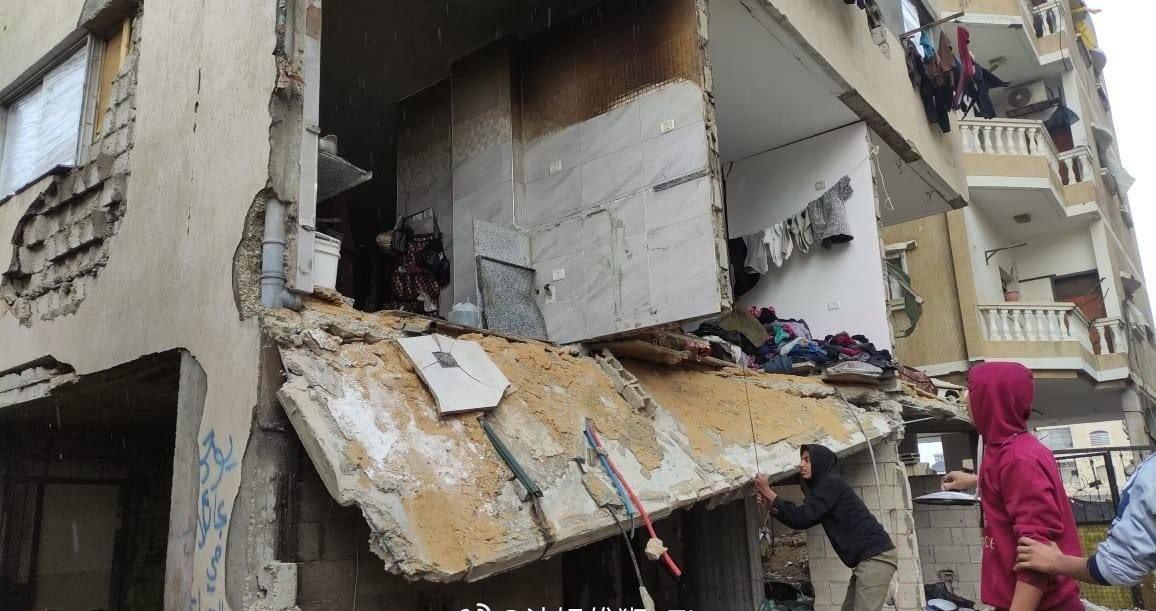 巴勒斯坦加沙市扎伊图恩街区,在以色列轰炸中遭受破坏的住宅楼在暴雨中进一步倒塌。 巴以冲突