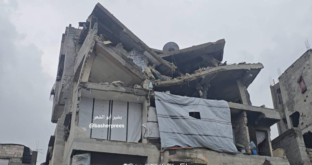 巴勒斯坦加沙市扎伊图恩街区,在以色列轰炸中遭受破坏的住宅楼在暴雨中进一步倒塌。