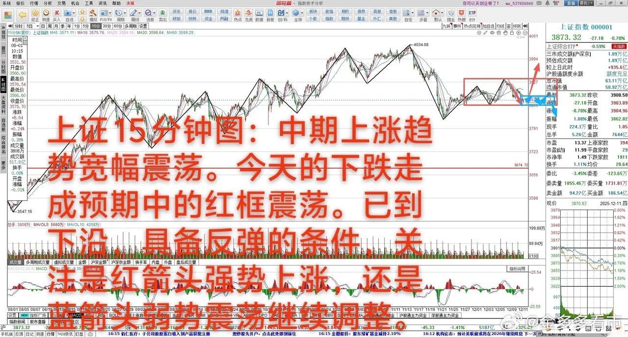 大A:具备随时止跌条件 12月11日 大A下跌0.7%,中期上涨趋势宽幅震荡。今天没站上3910点,走了弱势的预期,开盘下探去考验3859点。目前看还没止跌,但已经具备止跌条件了,明天上冲过了3878点,小回踩确认不破3878点,开始反弹,如果能过了3910点,大概率会突破3936点。明天如果冲不去,贴着3856低点收窄震荡,或者跌穿3856点,反拉上去,则走得更弱,要去考验3816点,甚至还会再创新低。 沪深300下跌0.86%,中期上涨趋势宽幅震荡。今天没走强,开盘冲不上去,之后一路下跌,略破了昨天低点,创4547点小新低。明天小下探后应该有反弹,如果反弹能过4610点,短期保持强势上涨。如果反弹上不去,围绕4550点附近收窄震荡,再创新低概率大,形成4640点小级别下跌结构。 创业板下跌1.41%,中期上涨趋势2892-3331点区间震荡。短期2892点小级别上涨结构,今天小创新高回落,走成3143-3246点震荡。明天小下探去考验3143点,能维持当前震荡,随后向上突破概率大。如果跌穿3143点,反拉上去,短期没那么快上涨。 科创50下跌1.55%,中期上涨趋势宽幅震荡。今天震荡下跌,没能上冲,走得比较弱。明天如果不能尽快站上1350点,短期则是弱势震荡。 今天领涨的题材概念:科创次新股、非金属材料、新股与次新股、风电设备、可控核聚变、金属新材料、商业航天、超导概念、柔性直流输电、电网设备、注册制次新股、银行、宁夏。今天是个普跌市场,很多板块出现一定幅度调整。这2天算力为首的大科技一直在调整,上证指数没法走强。商业航天依然强势,接下来再冲一冲概率大,这个上冲出来后,应该会短期高点。中期跟踪情况:1、军工装备下跌0.42%,中期上涨趋势宽幅震荡。短期2198点小级别上涨结构,今天冲击到2413高点附近回落,走成2356-2413点收窄震荡,这是酝酿突破的走法。明天再下探,不破2356点,维持当前震荡,随后向上突破概率大。如果跌穿2356点,反拉上不去,短期没那么快上涨,还会震荡下跌。2、低空经济下跌1.13%,中期上涨趋势1994-2210点区间震荡。今天震荡下跌,冲不上去,没能围绕2152点收窄震荡,短期调整幅度变大,要去考验2061点。如果要走强,需要尽量站上2136点,则有向上突破可能。3、半导体下跌1.19%,中期上涨趋势宽幅震荡。短期10679点小级别上涨结构,今天震荡下跌,没有破11599点,看成11599-11880点震荡,充分震荡向上突破概率大。如果跌穿11599点,则调整幅度变大。4、证券下跌1.48%,中期上涨趋势宽幅震荡。今天震荡下跌,没能反弹,走得比较弱,继续震荡调整,没那么快上涨。5、消费电子下跌1.82%,中期上涨趋势10485-12087点区间震荡。今天没能上冲,震荡下跌,短期调整幅度变大,当前看成是11039-11653点稍宽震荡。防守位11039点,跌穿了反拉上不去,则要去考验10485点。6、元件下跌1.87%,中期上涨趋势13269-15768点区间震荡。今天震荡下跌,没能冲击15527点,短期调整幅度变大。接下来震荡下跌,关注止跌的位置,如果破14846点,则走得更弱了。短期跟踪情况:A、目前市场上最强的是商业航天、CPO,突破震荡创新低,今天小震荡调整,随时有上冲可能。B、短期再关注算力其他细分,例如:铜缆高速连接、PCB、元件、半导体。目前还没突破,但有突破的迹象。A股指数A股波动A股收盘