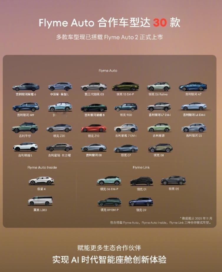 车若初见 魅族科技发战报,Flyme Auto 11月新增用户超20万,合作车型总销量超211万,持续刷新好成绩,Flyme Auto合作车型已经有30款,主打一个搭载数量多,覆盖车型广。您最喜欢的座舱系统是什么,评论区聊聊。