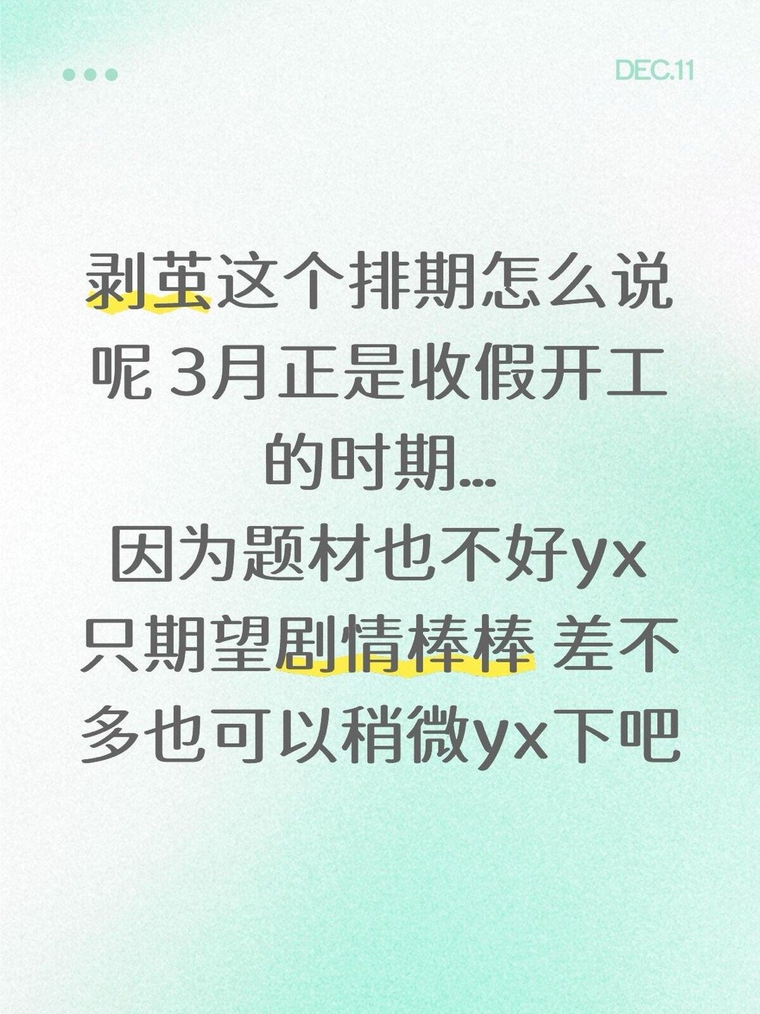 剥茧剥茧这个排期怎么说呢 3月正是收假开工的时期…因为题材也不好yx只期望剧情棒棒 差不多也可以稍微yx下吧,不说了期待齐思哲罗云熙|