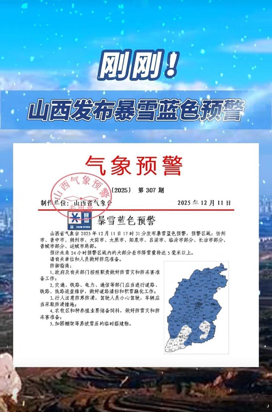 动态雷达追踪雨雪走到哪2025 年12月11日17时31分发布暴雪蓝色预警,预警区域:忻州市、晋中市、朔州市、大同市、太原市、阳泉市、吕梁市、临汾市部分、长治市部分、晋城市部分、运城市局部。预计未来24小时预警区城内的大部分县市降雷量将达5毫米以上。请有关单位和人员做好防范准备防御指南:1.政府及有关部门按照职责做好防重灾和防冻害准备工作;2.交通、铁路、电力、通信等部门应当进行道路、铁路、线路巡查维护,做好道路清扫和积雪融化工3.行人注意防寒防滑,驾驶人员小心驾驶,车辆应当采取防滑措施;4.农牧区和种养殖业要储备饲料,做好防重灾和防冻害准备;5.加固棚架等易被重压的临时搭建物。