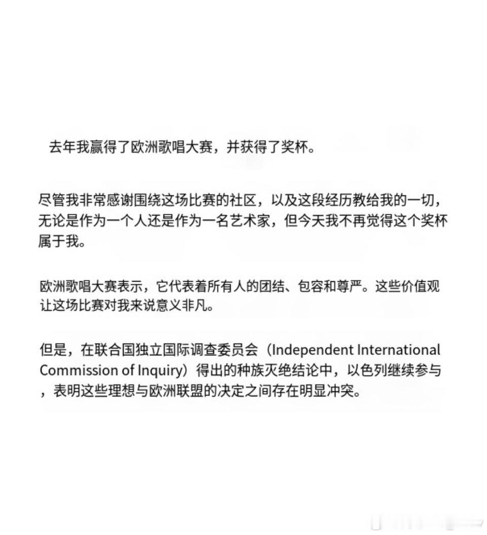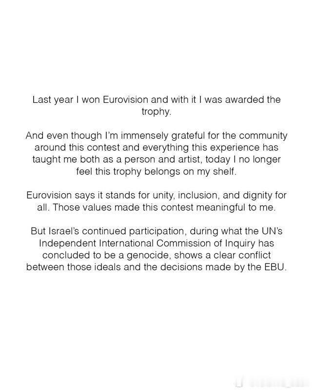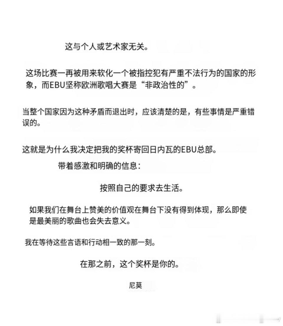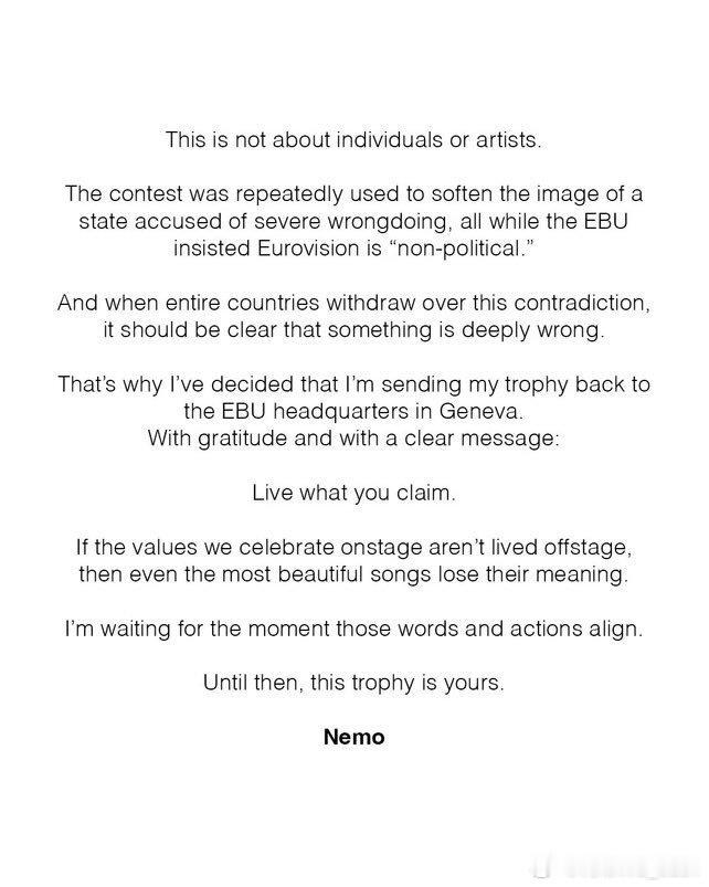 最新消息:2024年欧洲歌唱大赛冠军尼莫宣布退还奖杯,以抗议以色列参赛。