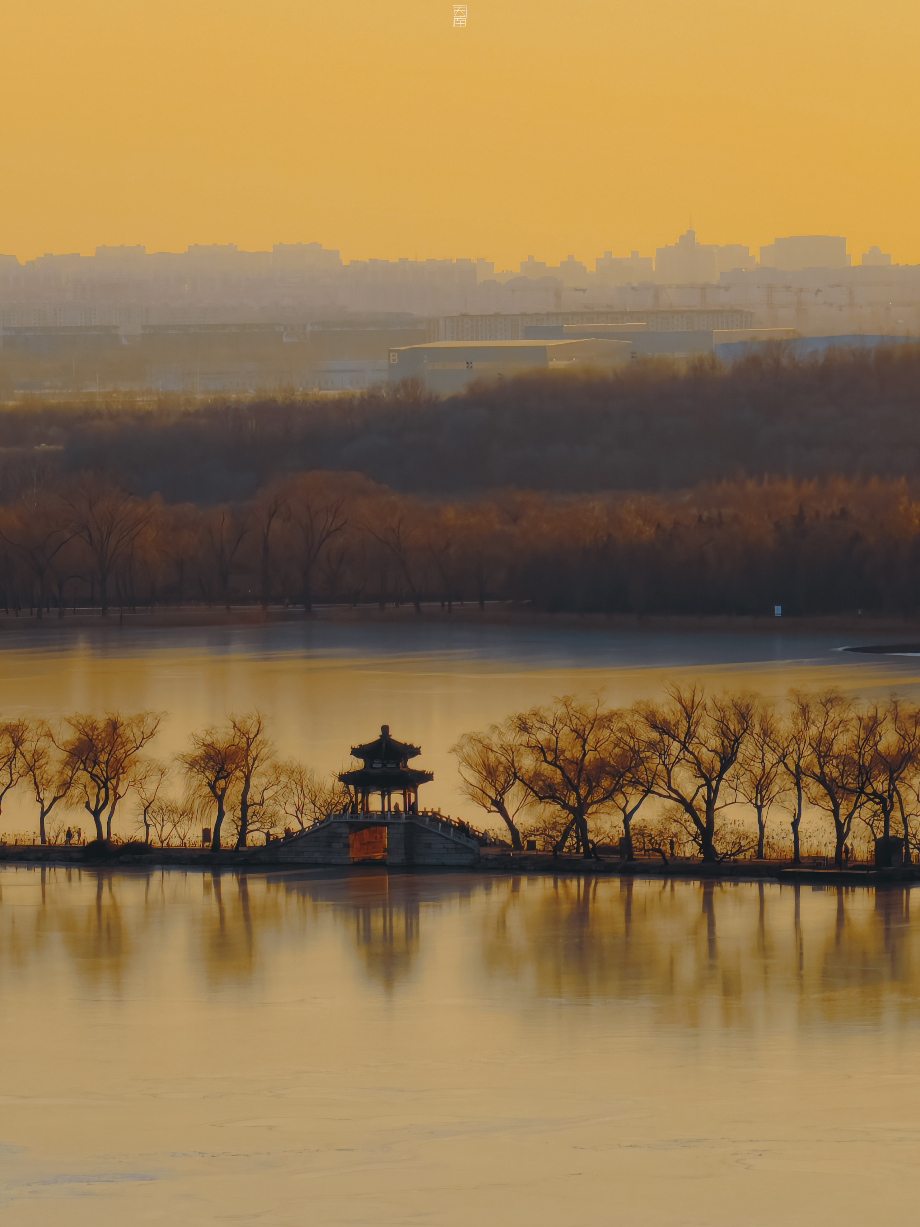 〖陶然冬暮,人间暖色〗 冬日傍晚,陶然亭浸在温柔的橙光里,桥上一对