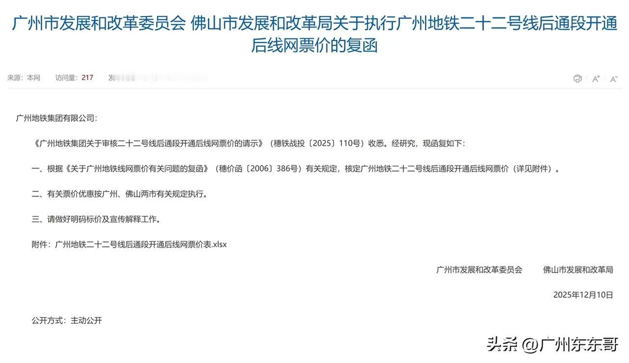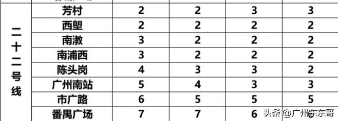 广州地铁22号线后通段票价获得批复 作为年内压轴登场的最后一条地铁,万众期待,线路票价也正式出炉了。 虽然是时速160公里的城际化地铁,但是价格和其他地铁线路一样,起步价都为2元,芳村至广州南站只要5元,前往番禺广场站则没有调整,仍为7元。 西塱至广州南则降为4元。 在批文所附的票价表中,也录入了10号线中大南门站的相关票价。这或许意味着该站将与22号线后通段同步开通。 22号线开通后,市区往广州南站又多了一条选择,同时可以大大减轻2号线的客流压力。