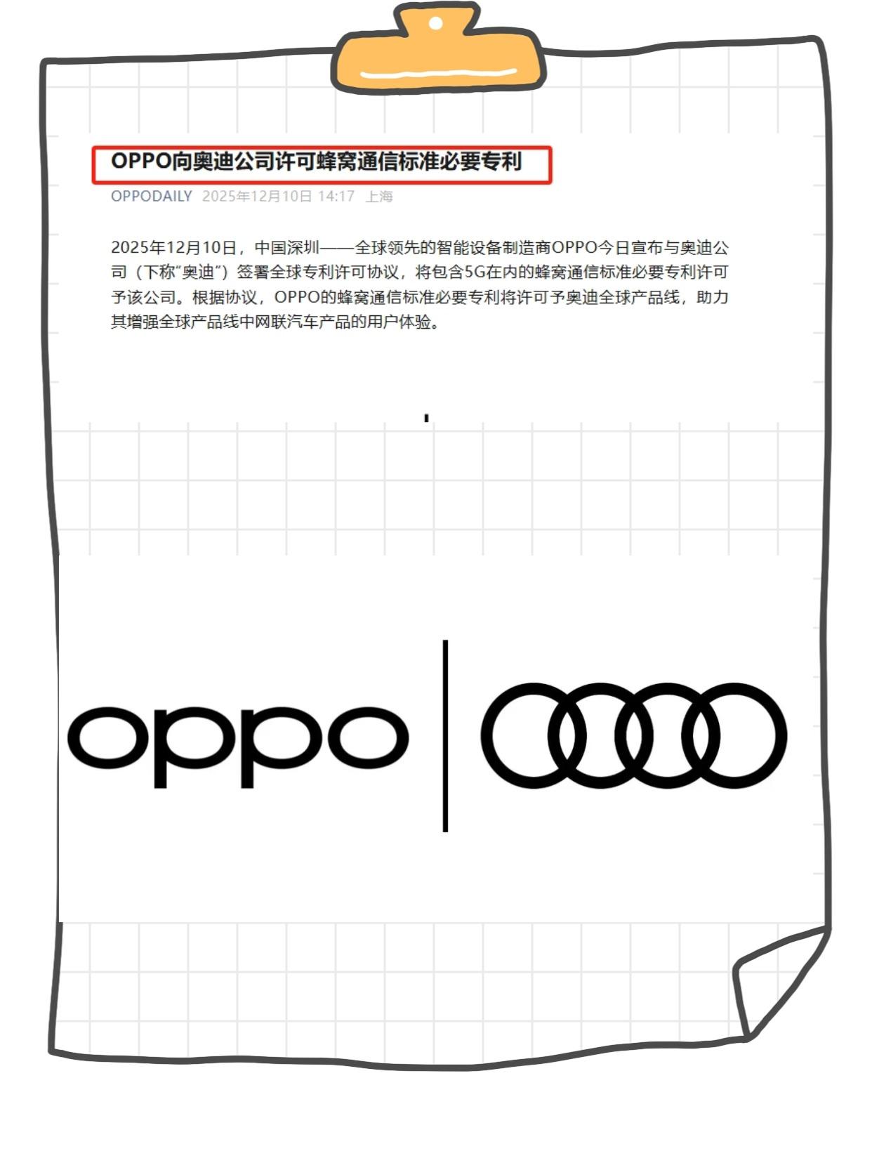 卡八个?😂OPPO跟奥迪签约的理由又+1 圈圈圆圆圈圈~ OPPO跟奥迪的品牌logo摆在一起莫名莫名和谐🤣 有网友说可以“卡八个”,我真的笑了…… 刚看到OPPO和奥迪签约,OPPO把包含5G在内的通信核心专利, 许可给奥迪全球的产品线 能让奥迪这种级别的车企找上门, 看得出OPPO的通信技术还是挺有两把刷子的💪 ✅毕竟OPPO的专利储备摆在那:全球申请超11.7万件,授权的也有6.5万多件, 5G 专利全球排第八,之前还跟大众、国内车企签过类似协议~好的企业就是向外输出技术,有研发资金再不断研发精进产品的良好循环,难怪OPPO近几年产品体验和销量都很出色,身边用OPPO的人都多起来了,像是今年火热的OPPO Find X9 系列,听说体验销量都很出生,很多不同地区的外国人也抢着买呢! OPPO奥迪合作 OPPO专利实力 OPPOFindX9Pro 数码圈大事件OPPO 新手机