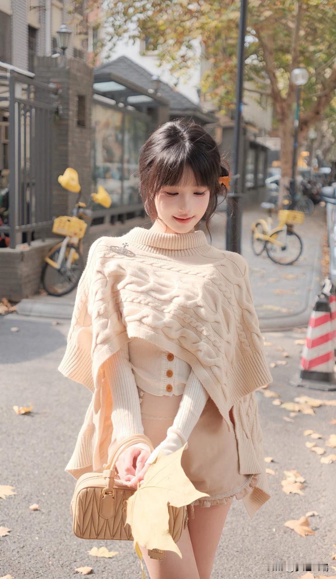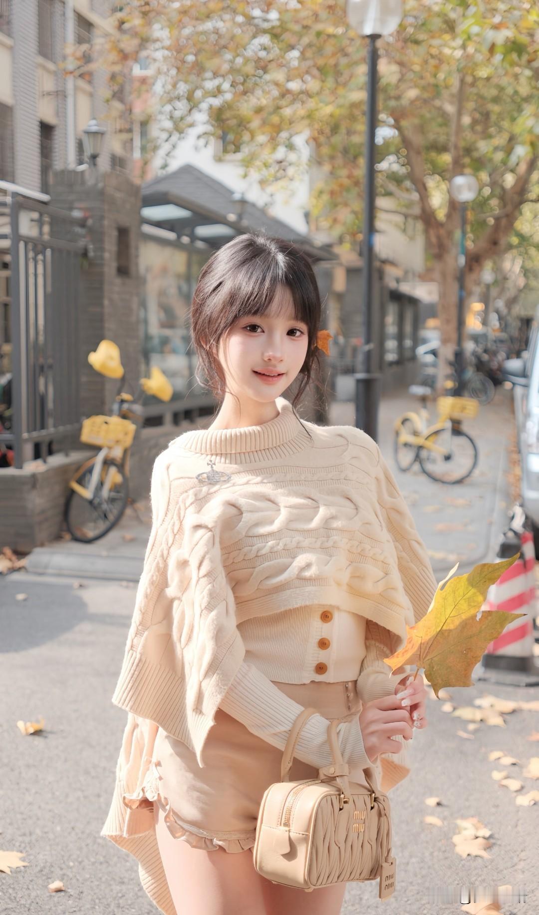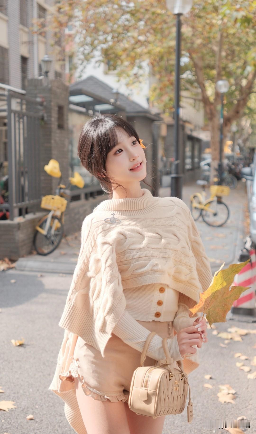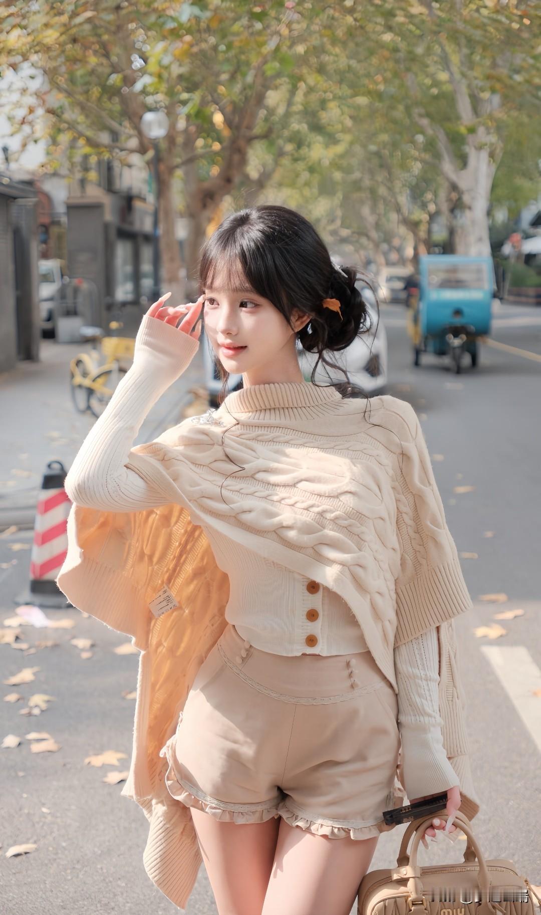 秋日漫步,白色毛绒外套搭配黑色长裤,优雅动人。
