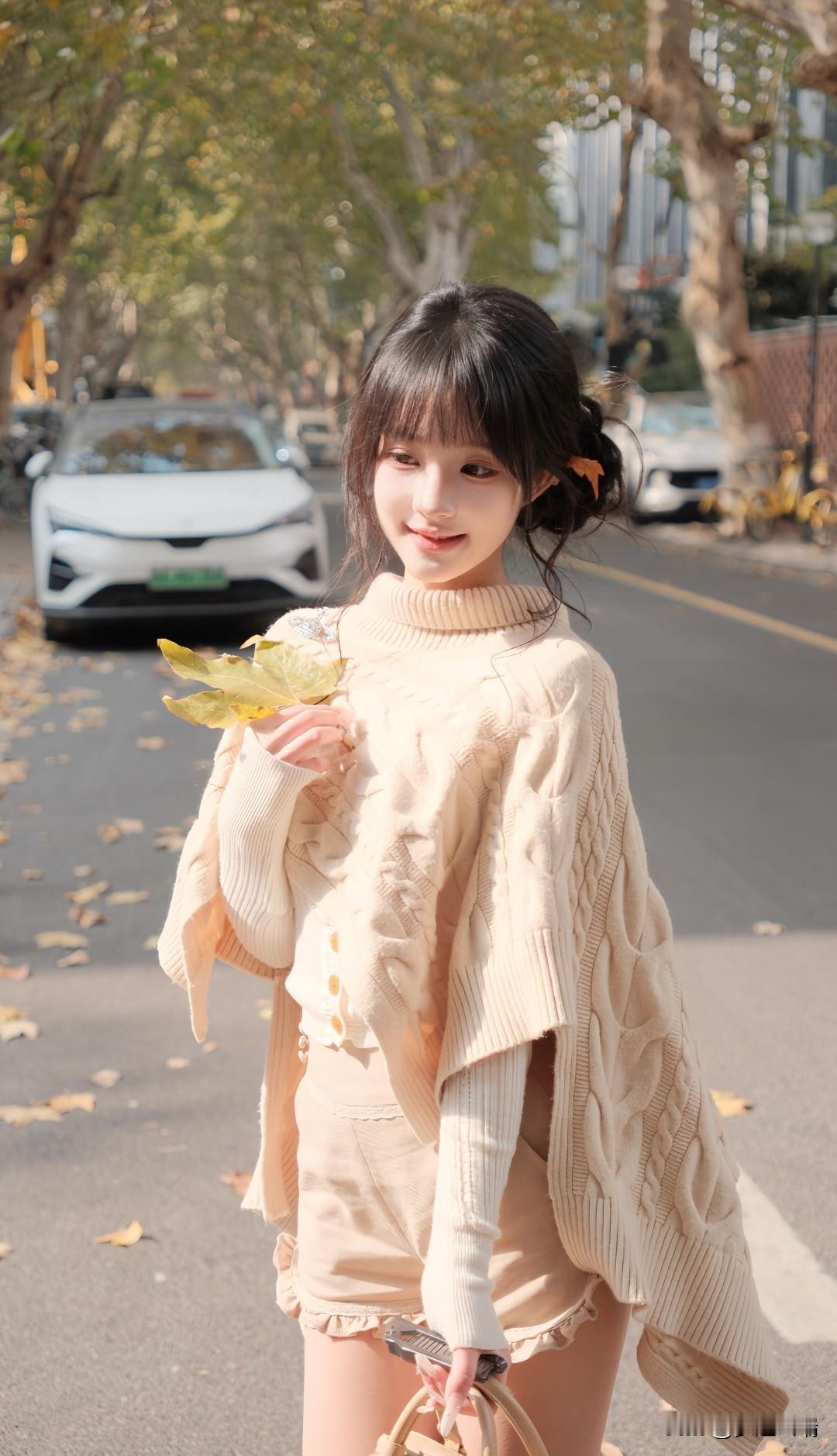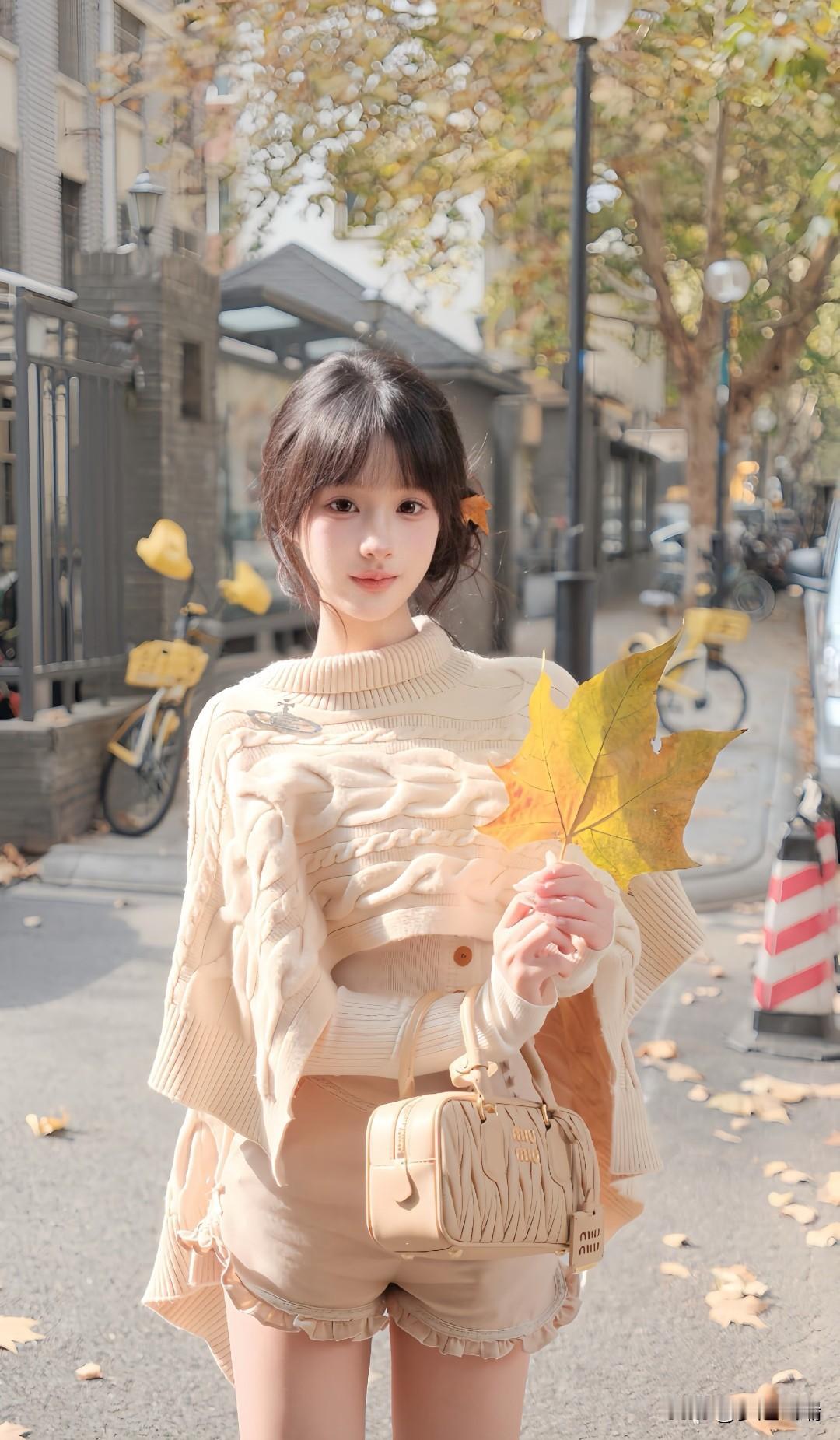 秋日暖阳下,少女手持枫叶,甜美可爱,尽显青春气息。