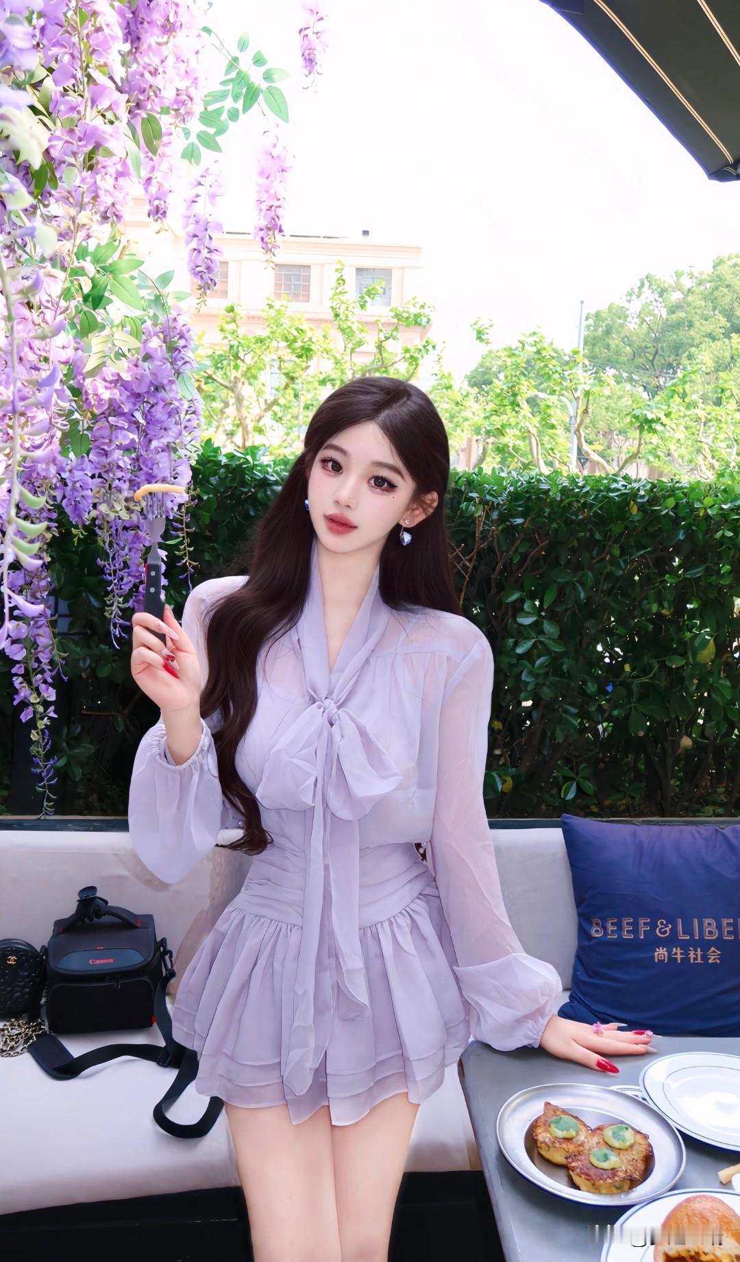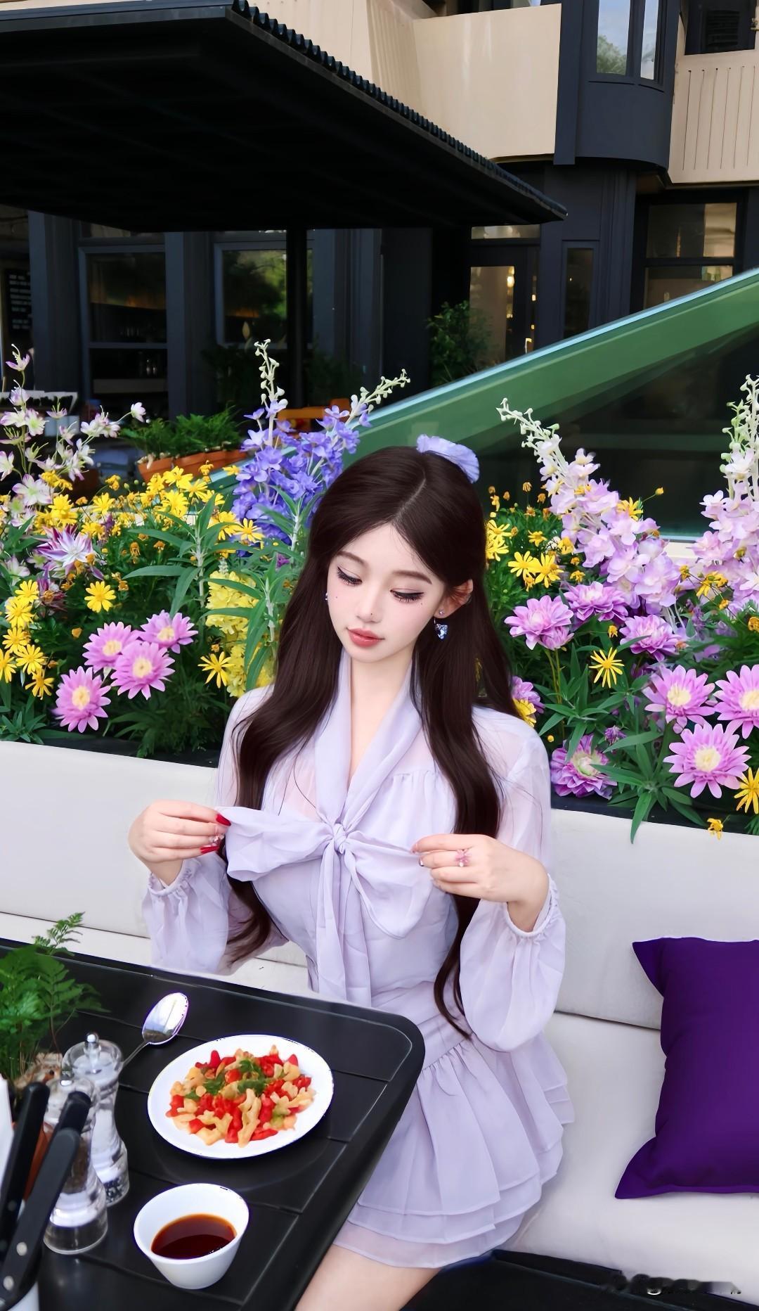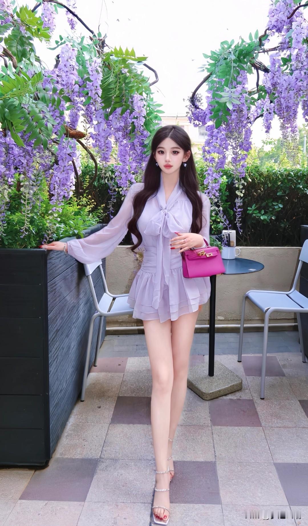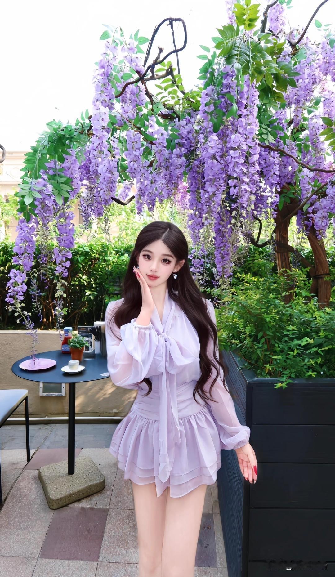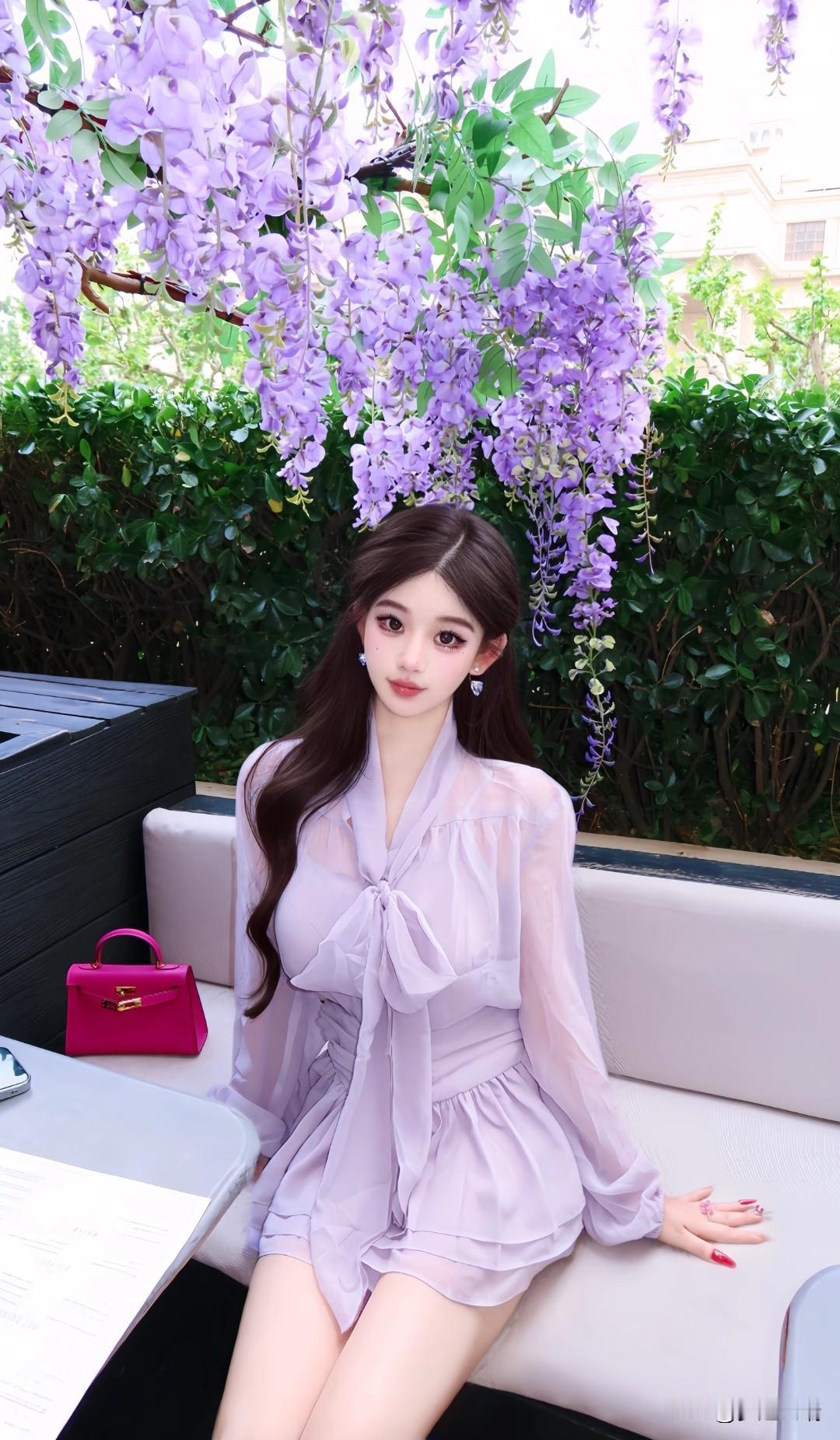《柔紫衬夏凉》树影把风滤成淡绿的纱,她立在这团软雾里,发梢松挽成圆髻,几缕
