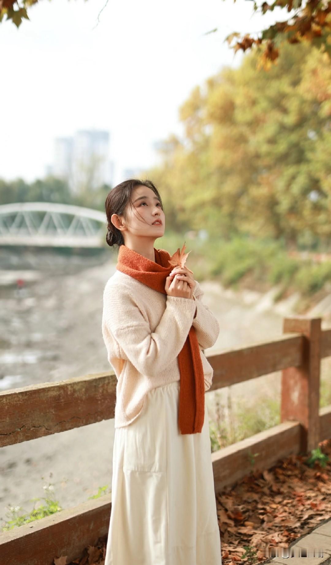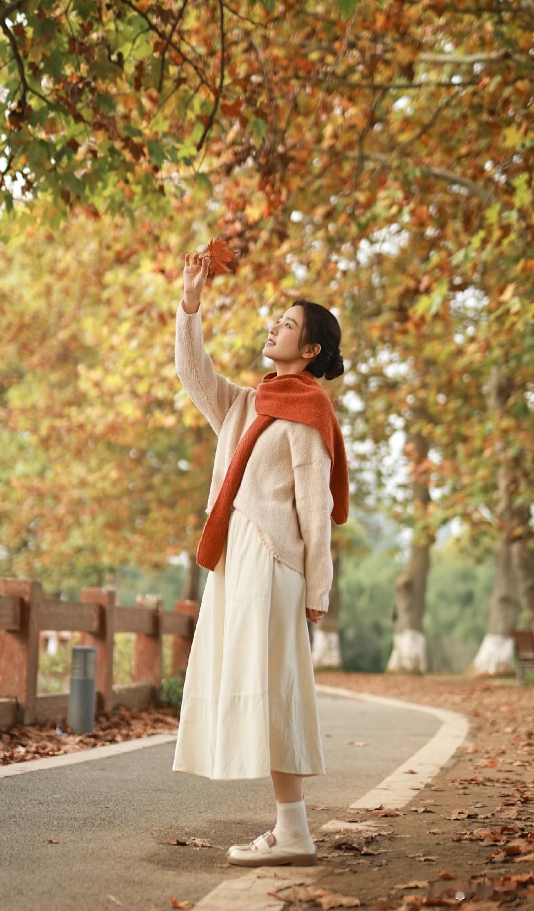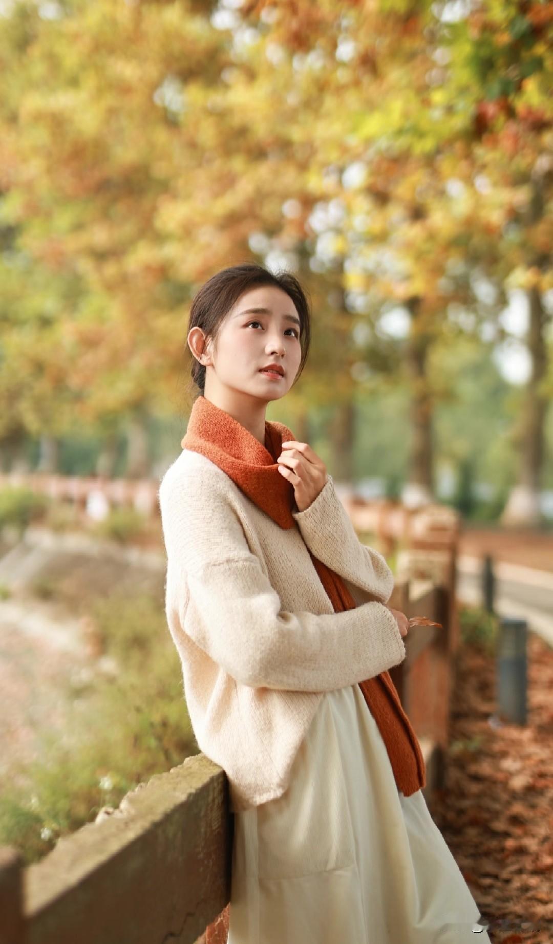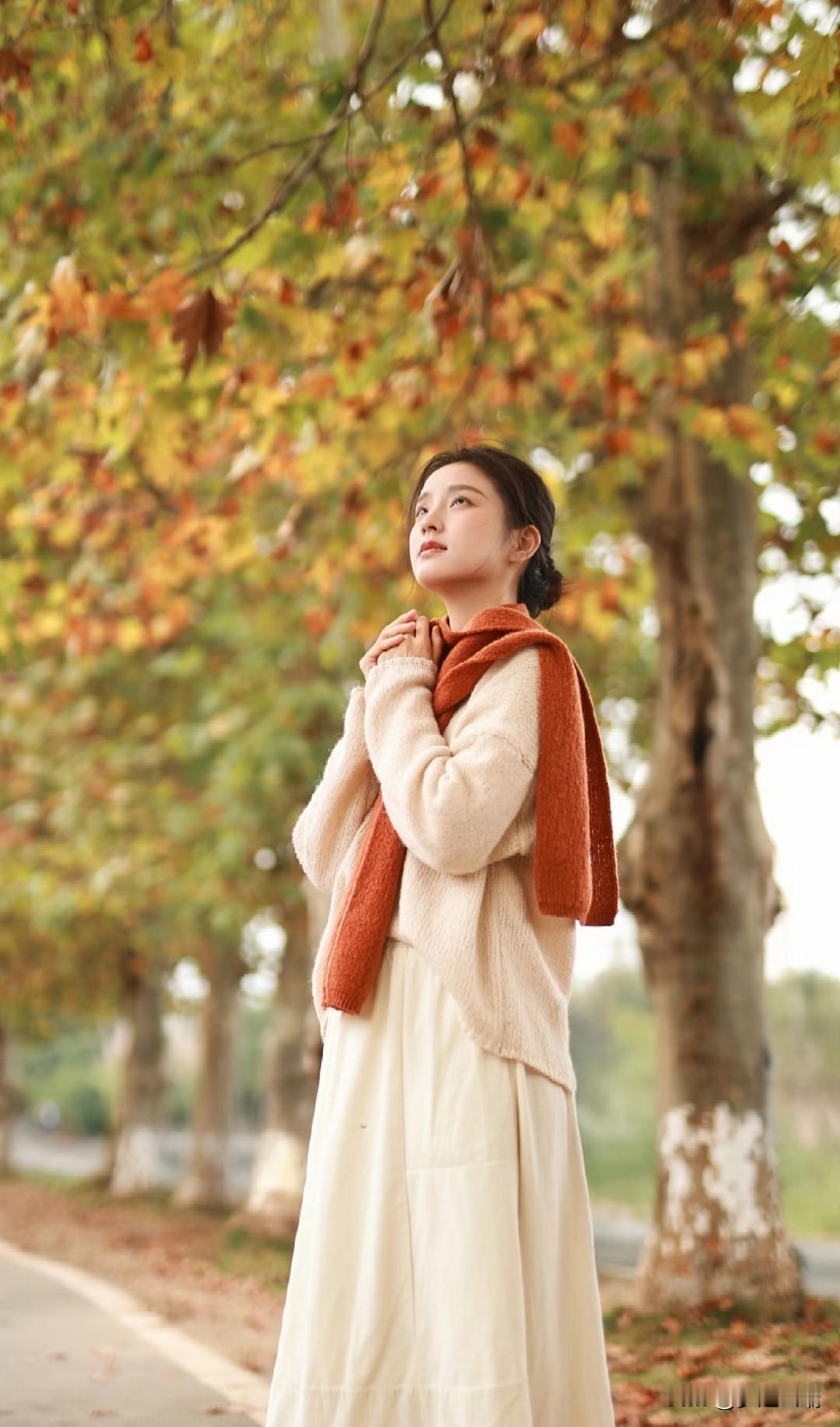 秋日漫步,白色毛绒外套搭配黑色长裤,优雅动人。