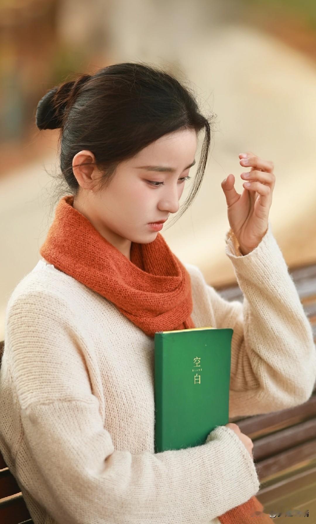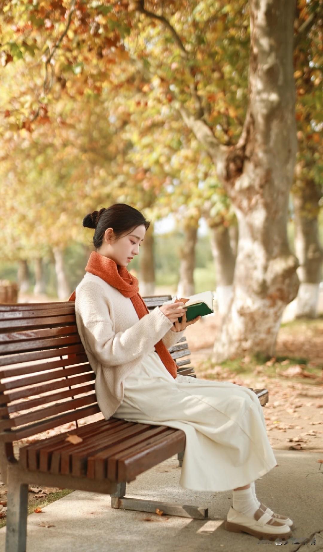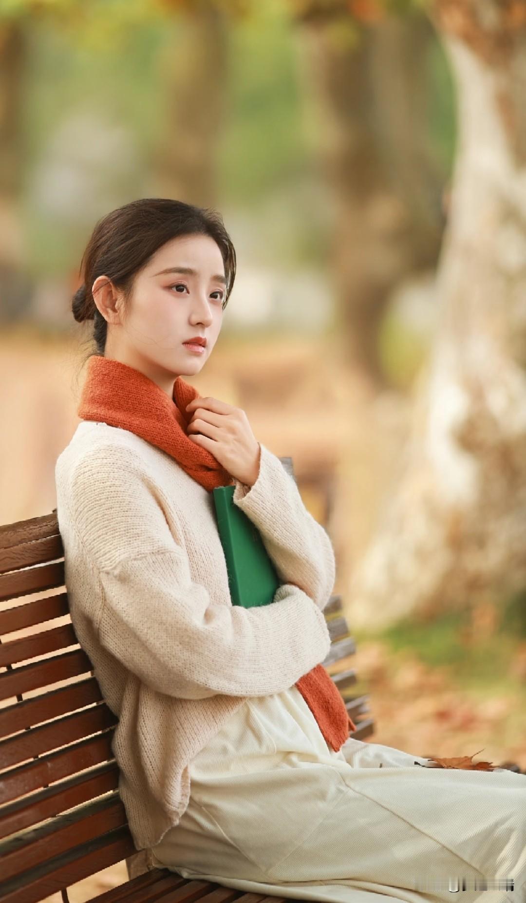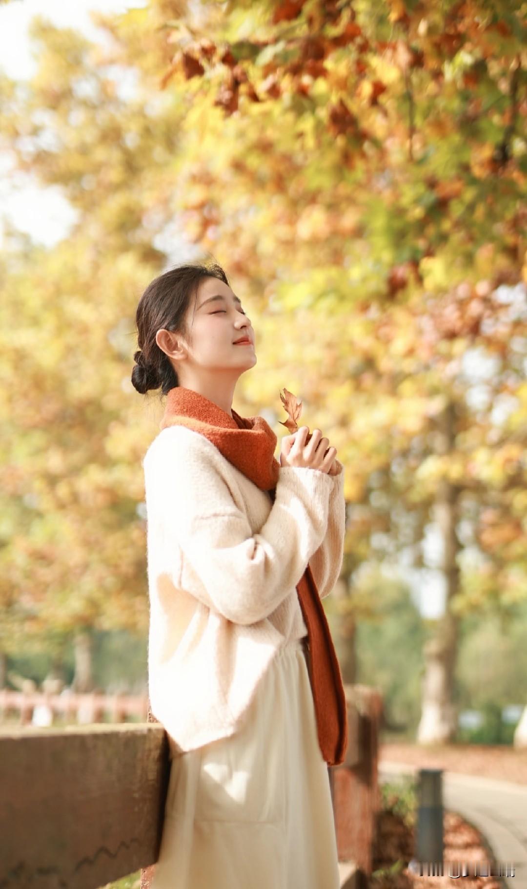 秋日漫步,白色毛绒外套搭配黑色长裤,优雅动人。