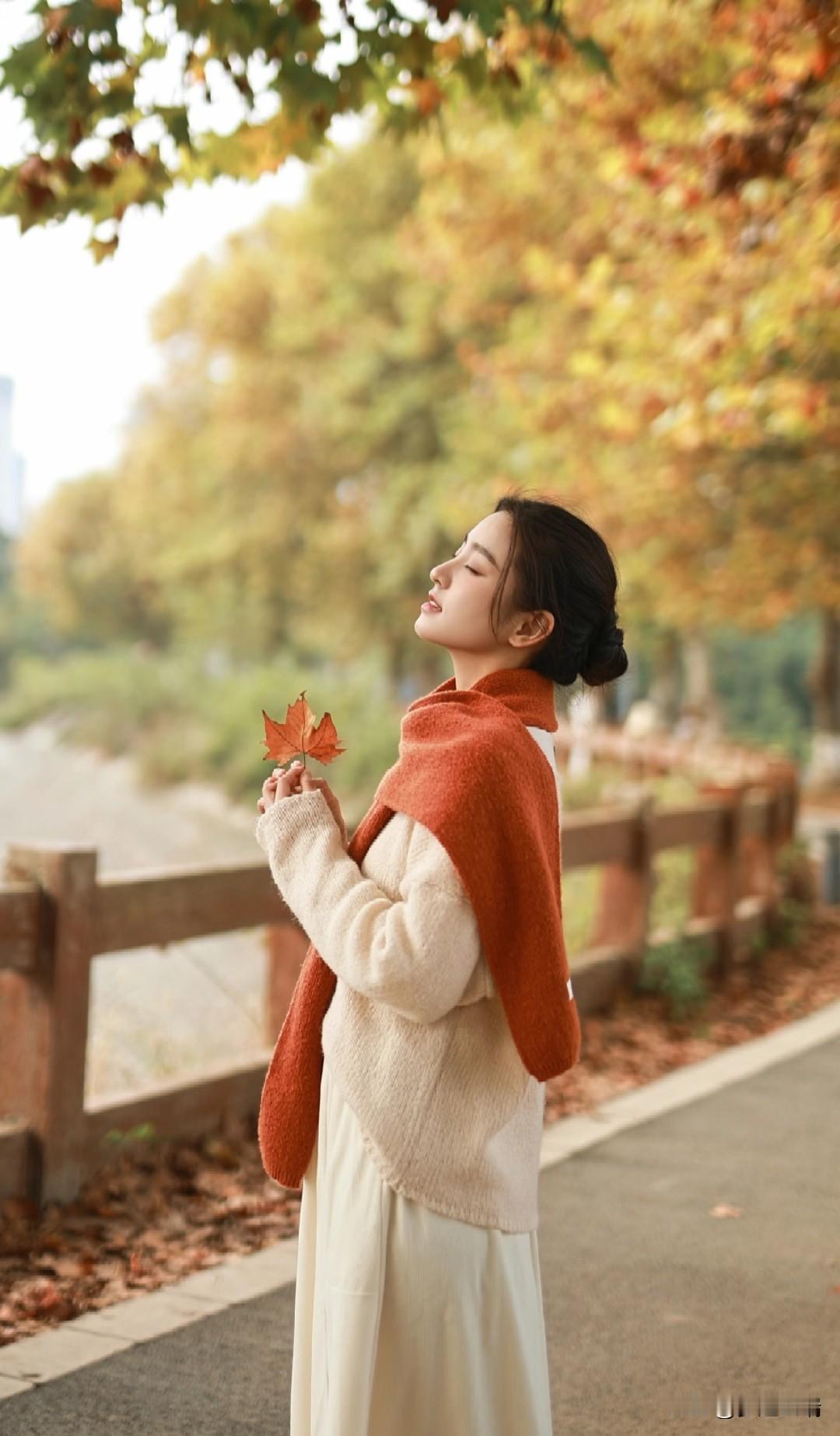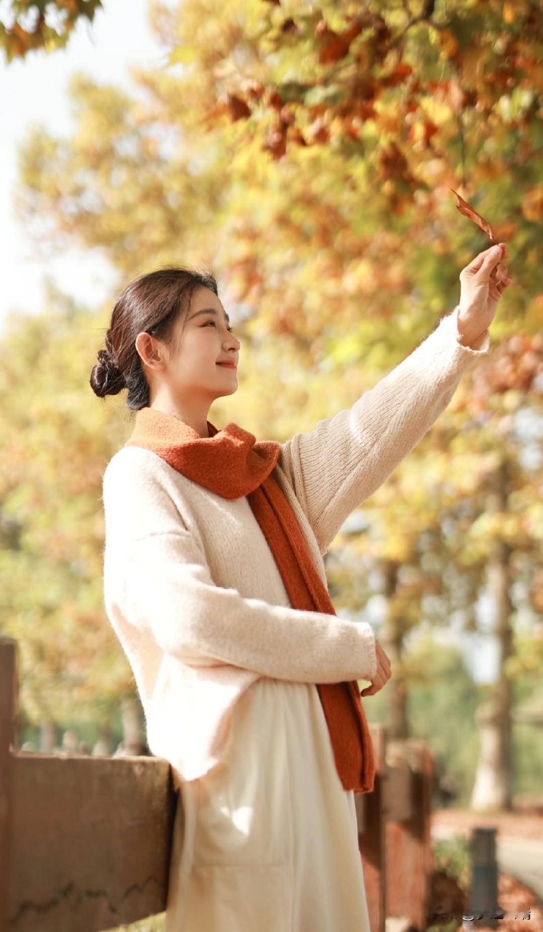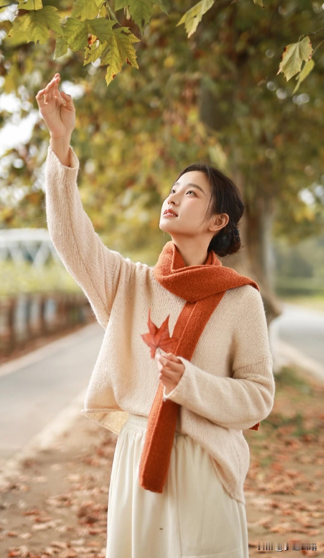 秋日暖阳下,少女手持枫叶,甜美可爱,尽显青春气息。