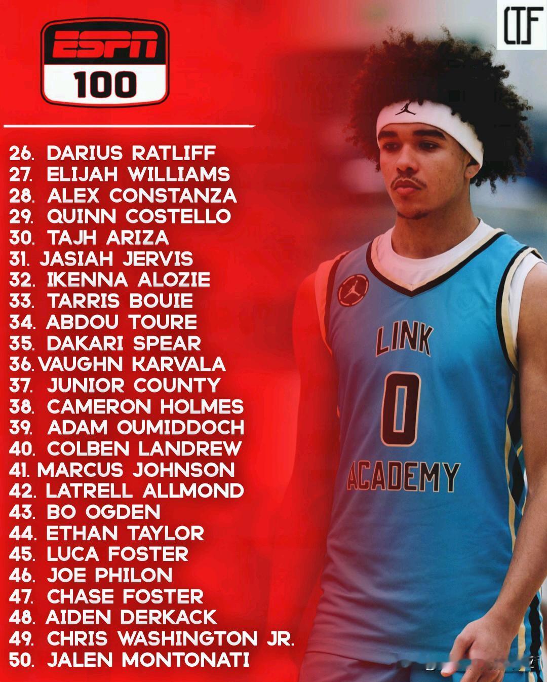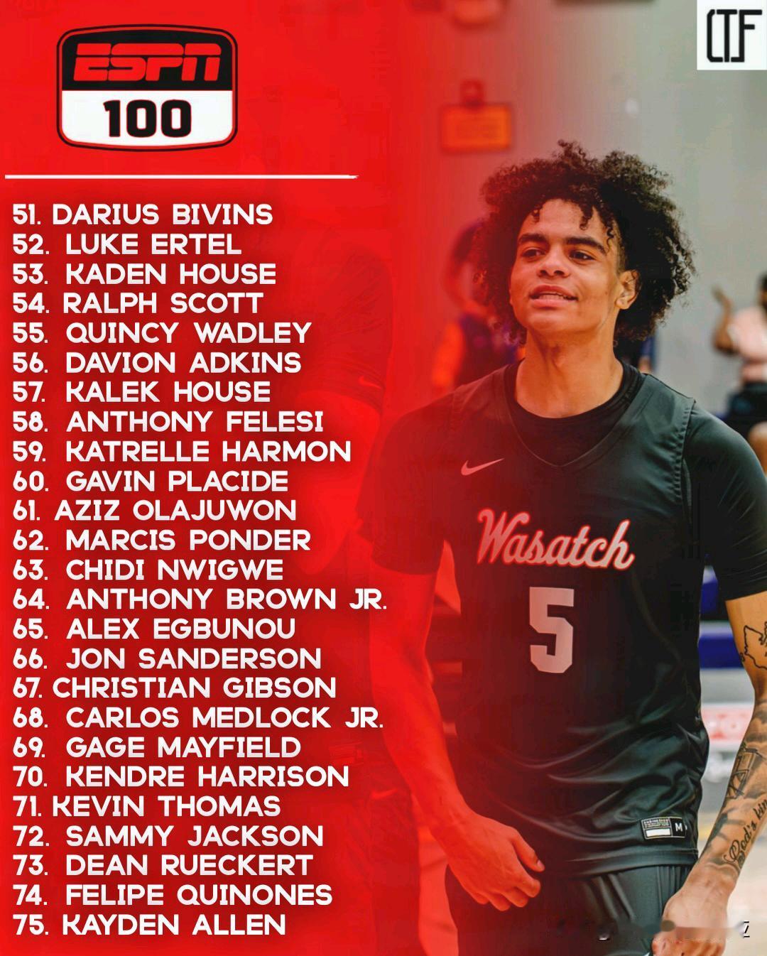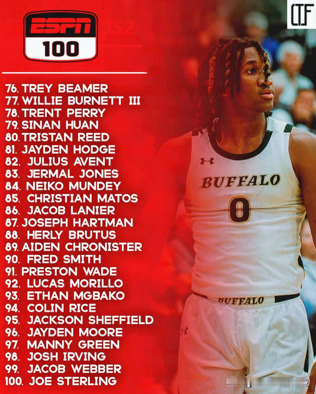 ESPN官网更新榜单,2026届招生 前锋Tyran Stokes稳居第一,跳级的侧翼Bruce Branch III排在第六位,USC内线Adonis Ratliff上涨至第10位,他上一期才86位,排名直接暴涨,选秀专家Jonathan Givony看好Adonis,NCAA男篮 普度大学中国内线郇斯楠Sinan Huan位居第79位。
