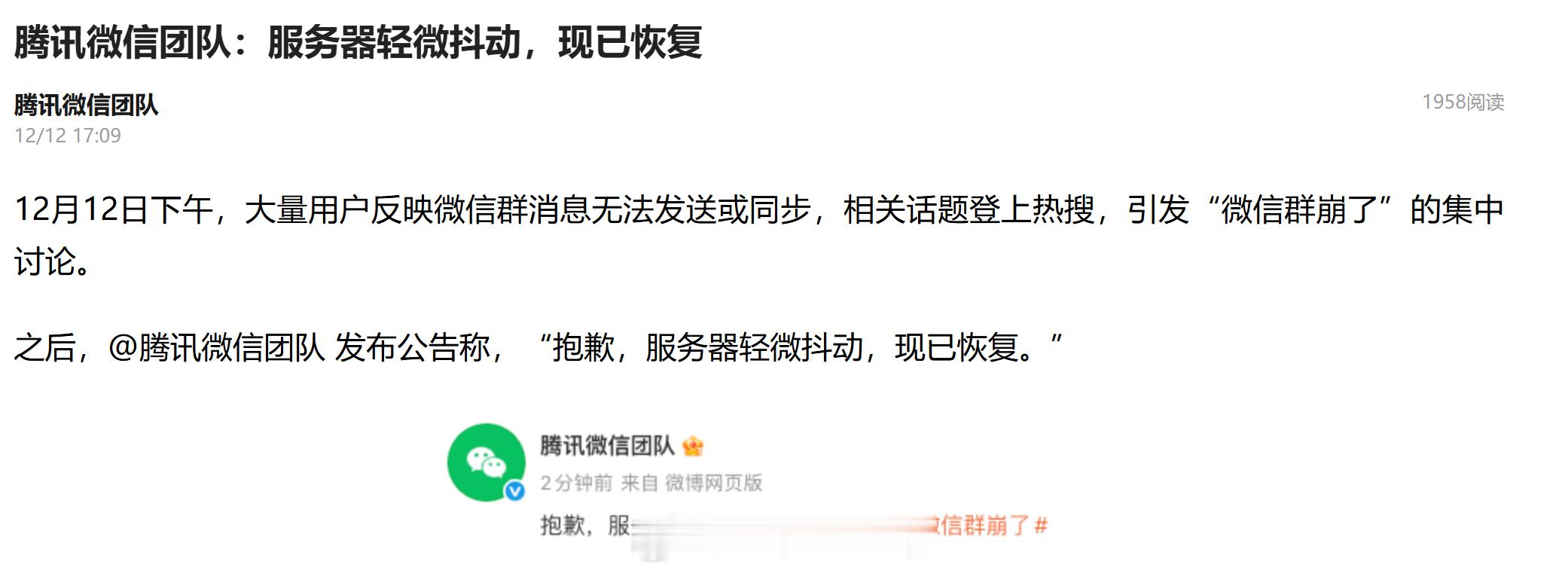 微信群崩了 服务器轻微抖动,腾讯微信团队回复很有意思哈哈哈哈。你们下午微信群