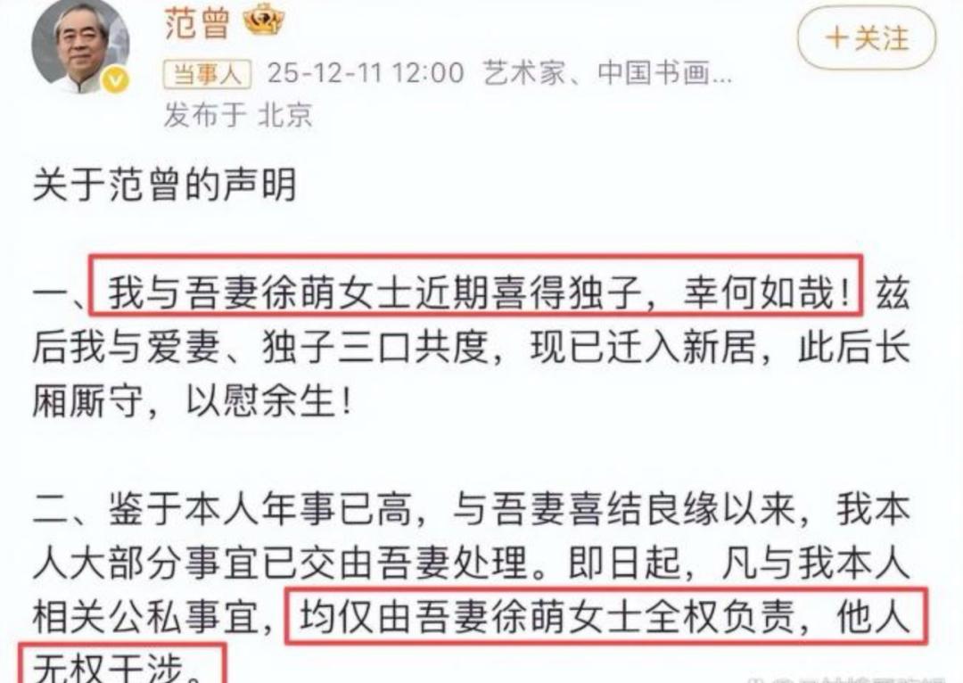 当你嘲笑短剧很狗血时,87岁的范曾刷新了这一认知,他老年得子,却发声明跟独女、继子断绝关系。 这个新闻,足以让本已“封肚”的张纪中,梦中惊坐起,再战15年。 也让邓文迪感叹,幸亏她遇见的是默多克,不然生三个女儿也分不到默多克的万贯家产。 也让田朴珺感叹:老王真的是个情种。 也让范曾前妻边宝华,楠莉若肝肠寸断。 再次证明:在某些男人眼里,情义千斤抵不过胸脯四两,胸脯四两又抵不过诞下龙子。 老来得子让范曾产生一种错觉,87岁算什么,可以向天再借500年,女儿算什么,他有的是能力生儿子。 她的嫩妻也是厉害,不仅会生儿子,还能让老头言听计从。 据说,这个嫩妻还是继子找来照顾好父亲的,结果自己反手被扫地出门。 范曾断亲,真的很绝。短剧也不敢这样编,但这两人真的很配。 绝的是情,不畏人言,配的是狠,只要自己开心。 就这份自私自狠劲儿,再活20年都没问题,毕竟自私者长寿、自私者无敌。 但老天的每一份馈赠,暗中都标好了价码,到了那一天,范曾付得起吗? 相信那又是另一部短剧了!