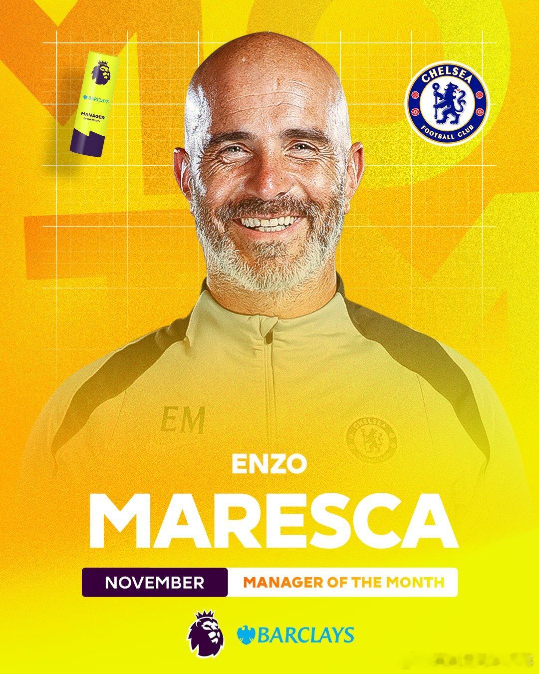 🔵官方:切尔西主帅马雷斯卡当选英超11月最佳主教练!击败了击败阿尔特塔、埃梅里、瓜迪奥拉等教练。切尔西在11月4场比赛取得3胜1平,净胜球6球。