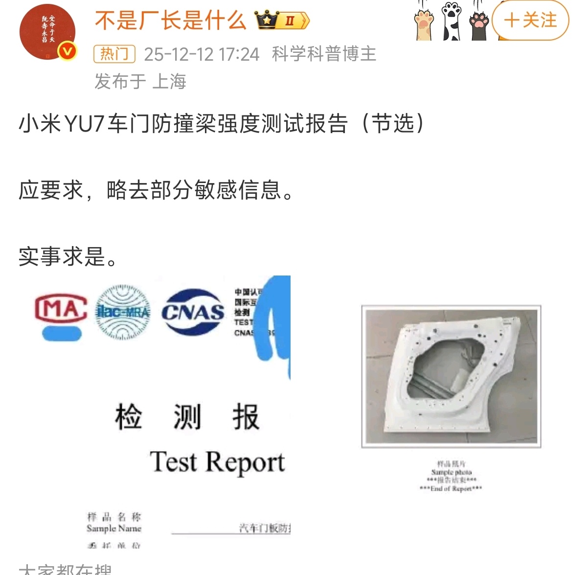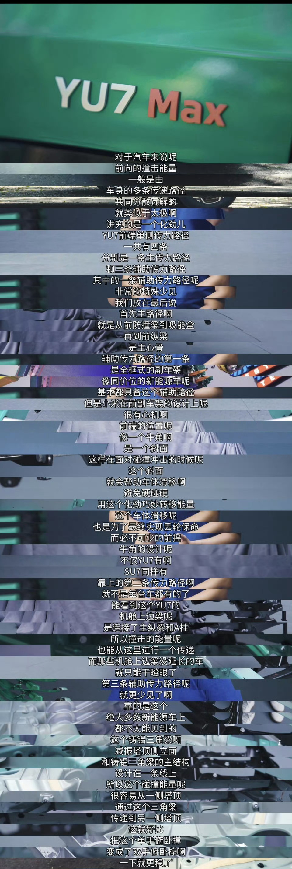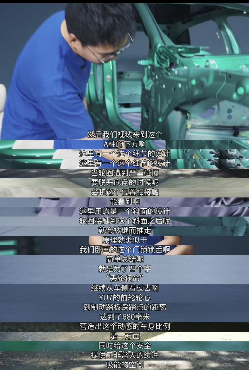 有人问:我买的车到底能应对多少极端危险其实,这从车身用料本身就能够看出来,小米汽车安全性出色,核心源于车身、电池、智能系统等多维度的硬核技术投入与超严苛测试验证以yu7为例子,它采用铠甲笼式钢铝混合车身,A柱、B柱内嵌2200MPa超强热气胀成型钢管,A柱承载能力提升35%,B柱提升70.5%。前防撞梁是1484毫米的“目”字形铝合金结构,覆盖车头74.4%区域,25%小偏置碰撞时也能高效吸能传力。侧围还有多宫格铝合金门槛梁,单点抗压超50吨,侧碰承载能力达82吨。前纵梁作为主路径,搭配三条辅助路径组成“一主三辅”传力机制,铸铝三角梁可将单侧撞击力导至另一侧。还搭载“丢轮保命”设计,碰撞时副车架牛角结构引导车轮脱离,配合车体滑移,避免车轮撞入驾驶舱,能让乘员舱形变量控制在安全阈值内。就连电池包也有极致的防护。电池包有14层物理防护,底部喷军工级聚脲防弹涂层,前方还设独立防撞梁与四根高强度横梁。采用电芯倒置布局,极端情况高温会向下喷发,且有17层高压绝缘防护,大幅降低电池热失控和短路风险,全方位守护电池安全。所以,小米汽车才能在所有的测试和实际碰撞中拥有非同寻常的表现真正的好产品就是,无惧一切测试,越是对比越赢得越多