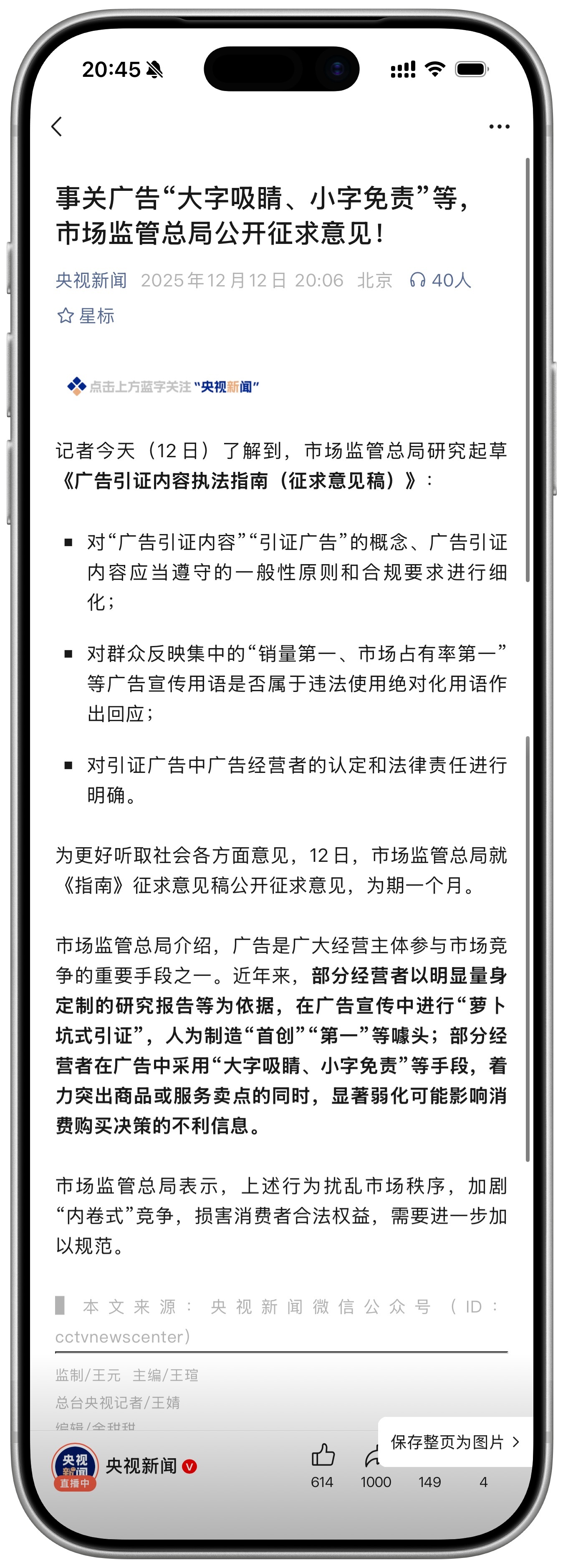关于广告“大字吸睛、小字免责”市场监管总局在征求意见了。不管怎么说对用户来说都是好事,希望以后各大厂商都能真诚一些。