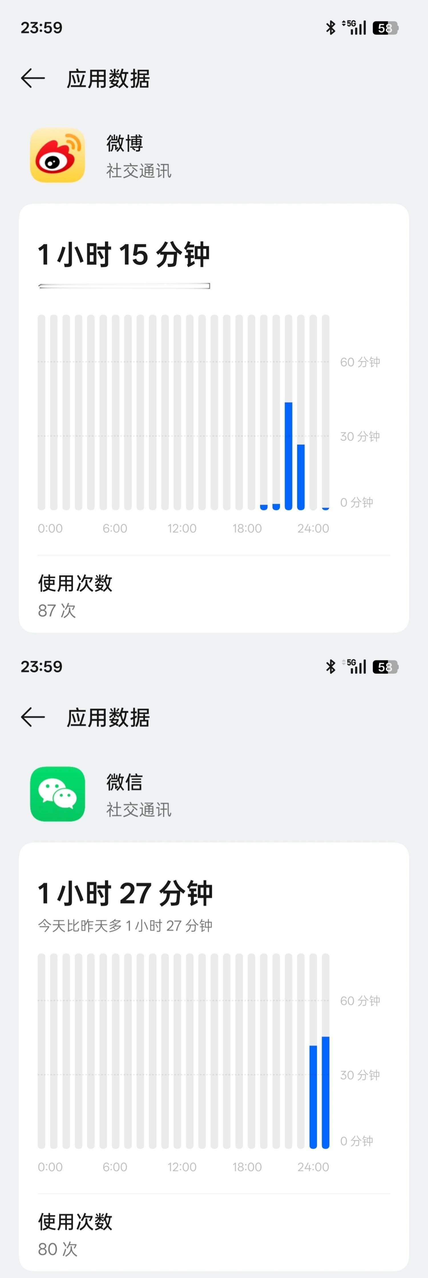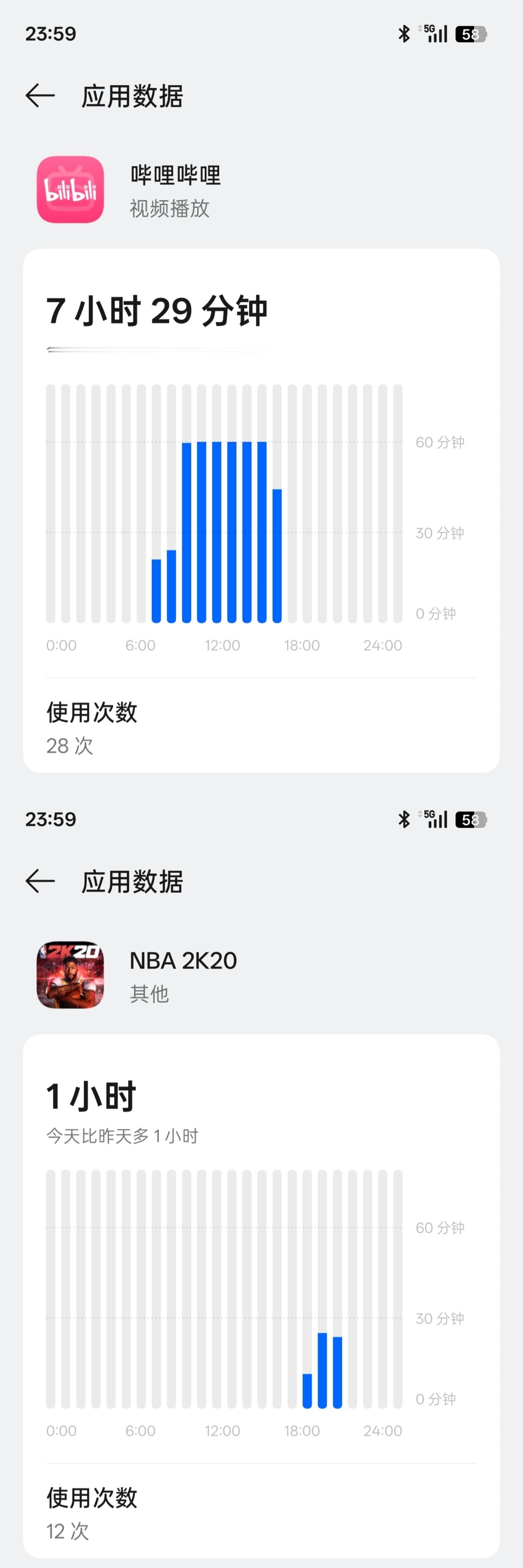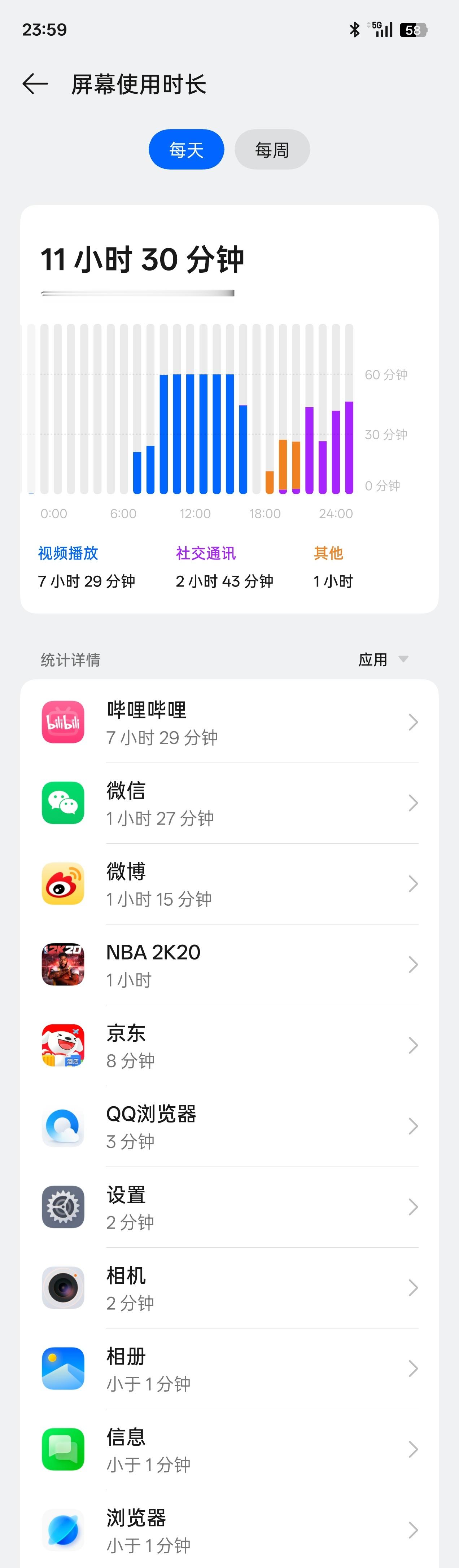 一加Ace 6T这续航真的挺离谱的。8300毫安时电池,早上7点34分满电开始用,亮屏时间11个半小时的超重度使用(1080P视频7个半小时,微信1小时27分钟,微博1小时15分钟,NBA2K游戏1个小时),到晚上23点59分,剩余电量居然还有58%?妥妥用两天?真的有点夸张了哈。