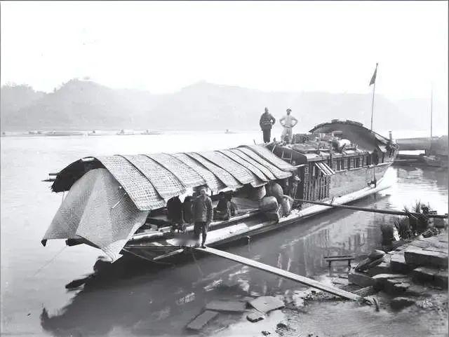这是1908年12月13日四川乐山江面的“游艇”,其实这是当时川江流域常见的木构运输船,只是被用作了载客的“游船”,船身狭长,覆着竹篾编织的篷顶(部分篷布已掀开),舱内堆着货物与杂物,透着实用的烟火气。 船舷边立着几位行人,船尾搭着长长的竹篙,岸边是石砌的滩涂,远处江面朦胧、山峦隐约,这不是现代意义的“游艇”,是清末乐山人沿江出行、兼作游览的“民生船”。