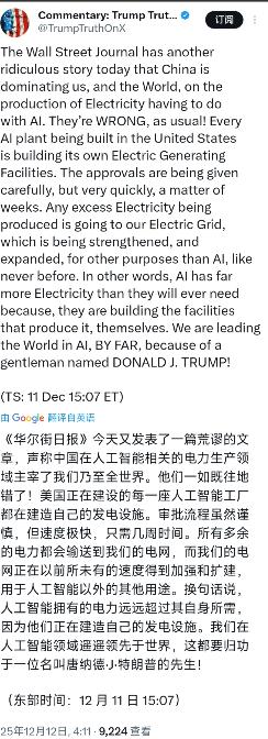 特朗普今天(北京时间12月12日)发文写道:“《华尔街日报》今天又发表了一篇荒谬的文章,声称中国在人工智能相关的电力生产领域主宰了我们乃至全世界。他们一如既往地错了!美国正在建设的每一座人工智能工厂都在建造自己的发电设施。审批流程虽然谨慎,但速度极快,只需几周时间。所有多余的电力都会输送到我们的电网,而我们的电网正在以前所未有的速度得到加强和扩建,用于人工智能以外的其他用途。换句话说,人工智能拥有的电力远远超过其自身所需,因为他们正在建造自己的发电设施。我们在人工智能领域遥遥领先于世界,这都要归功于一位名叫唐纳德小特朗普的先生!”   北京时间12月12日,特朗普在社交平台上火力全开,矛头直指《华尔街日报》当天的一篇报道。   他在文中怒斥报道称“中国在人工智能相关电力生产领域主宰世界”的说法荒谬,还强调美国AI工厂都在自建发电设施,审批只要几周,多余电力能并入正加速扩建的电网,甚至直言美国AI领先全靠自己。   同一天,特朗普还现身纽约证券交易所敲响开市钟,讲话里重申着减税计划,把股市涨跌看得很重。   这种一边谈经济政策一边为美国AI实力辩护的姿态,倒是符合他一贯的风格。   不过从近期美媒相关报道看,事情或许没那么简单,美国确实有科技和能源企业在为AI建发电设施,亚马逊砸了超5亿美元搞小型模块化反应堆,埃克森美孚也在搭天然气发电站给数据中心供电,谷歌之前也跟核电企业签了合作协议。   但要说审批只要几周,就有点站不住脚了。   特朗普今年5月签过行政令改核管理流程,要求18个月内出审批结果,这已经是加急后的速度,跟“几周”差得远。   电网扩建的说法也得打个问号,有电力专家刚从中国考察回来,直言美国电网太脆弱,加州、得州一到用电高峰就发预警,储备率通常只有15%。   反观中国,电力备用容量是需求的两倍以上,农村屋顶全是光伏板,有些省份的太阳能供电量就抵得上印度全国。   OpenAI上个月还警告,美国去年新增发电51吉瓦,中国是429吉瓦,这差距摆在那。   说白了,AI这东西就是电老虎,ChatGPT一天耗电顶1.7万个美国家庭,未来几年美国AI电力需求年增速可能超30%。   企业自建电站其实是被逼的,电网实在跟不上,中国能在这领域有优势,是几十年提前布局的结果,从发电到输电全链条都有规划。   美国靠私人投资搞基建,追求短期回报,很难跟需要长期投入的电力项目匹配。   这种差异背后其实是中美科技竞争的缩影,美国在AI大模型上有先发优势,但能源这块的短板很明显;中国靠着扎实的电力基建,正在慢慢缩小差距。   特朗普的表态更像一种信心展示,但行业数据不会说谎。   以上都是个人观点,对此您有什么不同的看法,可以在评论区留言讨论!!!
