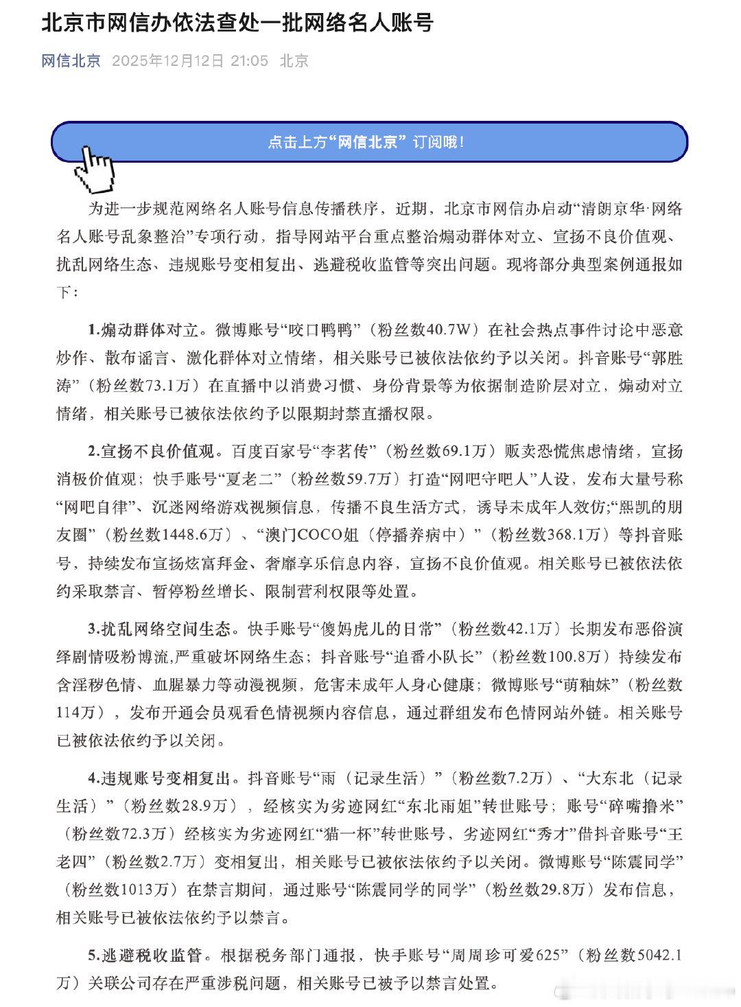【网信部门点名陈震,周周珍可爱关联公司存在严重涉税问题】12月12日,网信北京公众号发文,通报北京市网信办依法查处一批网络名人账号,其中包括:微博账号“陈震同学”(粉丝数1013万)在禁言期间,通过账号“陈震同学的同学”(粉丝数29.8万)发布信息,相关账号已被依法依约予以禁言。根据税务部门通报,快手账号“周周珍可爱625”(粉丝数5042.1万)关联公司存在严重涉税问题,相关账号已被予以禁言处置。