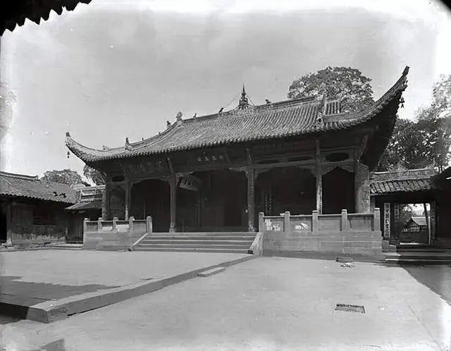 这是老照片里的四川保宁府张飞庙(今阆中张飞庙),主殿是川北风格的木结构古建,飞檐翘角如羽翼般舒展,屋脊上的装饰构件虽显斑驳,仍透着庄重的气势。 殿宇立于石砌台基之上,几级石阶通向开阔的前廊,廊下立柱撑起通透的空间,隐约能看到殿内的幽暗,木构的纹理浸着岁月的沉暗。庙院的空地宽阔平整,四周衬着古树枝桠,没有后世的游人簇拥,只有建筑本身的肃穆与安静。