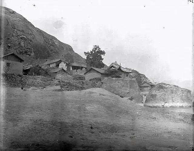这是老照片里的四川广元皇泽寺,它嵌在临江的崖壁之上,一半是凿入山石的佛龛石窟,一半是依崖而建的土木民居与殿宇;下方的屋舍是简陋的灰瓦土墙,与崖壁石窟连为一体,像那时当地人“依寺而居”的寻常景象。