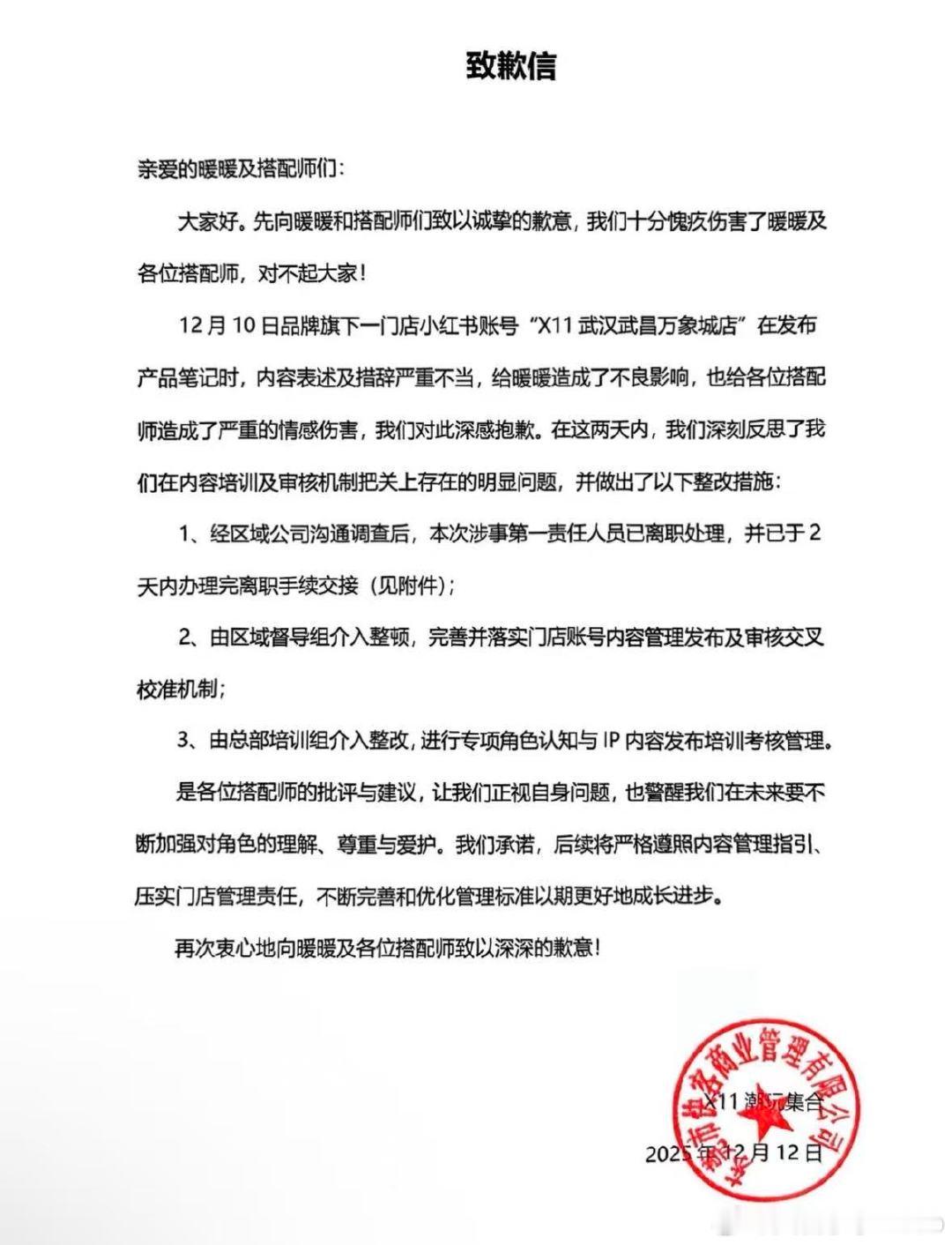 【X11道歉】X11致歉信 12月12日,发文道歉:12月10日品牌旗下一门店小红书账号“X11武汉武昌万象城店”在发布产品笔记时,内容表述及措辞严重不当,给暖暖造成了不良影响,也给各位搭配师造成了严重的情感伤害,我们对此深感抱歉。在这两天内,我们深刻反思了我们在内容培训及审核机制把关上存在的明显问题,并做出了以下整改措施:经区域公司沟通调查后,本次涉事第一责任人员已离职处理,并已于2天内办理完离职手续交接(见附件);由区域督导组介入整顿,完善并落实门店账号内容管理发布及审核交叉校准机制;由总部培训组介入整改,进行专项角色认知与IP内容发布培训考核管理。