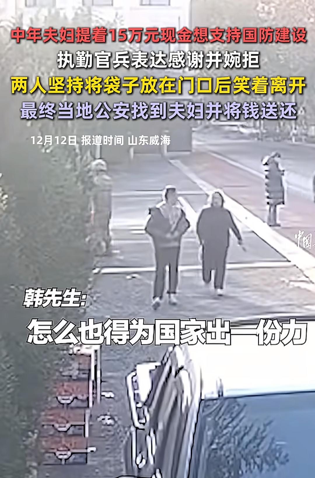 格局太大了!山东威海,一对中年夫妇拿着个手提袋送到了北部战区海军支队营区门口,士兵原本以为是有事来求助的,结果袋里里竟然是捐给部队15万元现金! 夫妻两人说作为中国老百姓,我们也想为国家出一份力做一点贡献,这些钱就是用于支持国防建设! 执勤的士兵听闻非常感动,但是哪里敢收下,连连感谢并且拒绝,不拿群众一针一线已经深深扎根在他们心里了。 但是夫妻俩还是坚持捐钱,直接放下袋子就走了,士兵也不敢擅自离岗去追,能立刻联系当地公安帮忙。 最后也是成功把钱还回去了,简直是诠释了军民鱼水情! 其实细看很发现这对中年夫妻穿得很普通,明显不是什么大富大贵的人,但是却有这样的觉悟拿出存款来支援国防建设。 这也没错,正是因为我们国家足够厉害,边防力量足够强,我们才有安稳日子过。 惭愧啊和他们比起来,我就相形见绌了,不过之前地震和疫情我也会捐一两百块钱,就为社会出一份力了。