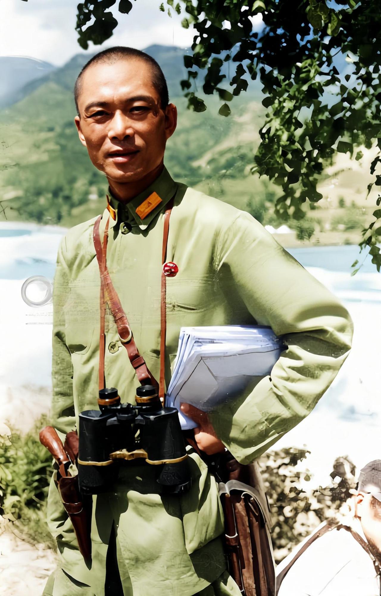 这张照片里的夏德贵,是国民革命军第76师的高级军官(他后期担任该师师长),照片中的他身着制式军装,领口、胸前的徽章透着军人的规整,肩头斜挎的望远镜、腰间的配枪,是战时军官的典型装备,怀里还夹着文件。 身后山野环境,应是战时的前线或驻地——夏德贵是滇西反攻战中的重要指挥官之一,1944年曾率76师参与红崖山战役、芒市收复战等,为滇西抗战的推进立下战功;而在更早的桂南会战中,他以副师长身份参与了部队调度,是抗战时期的实战派军官之一。