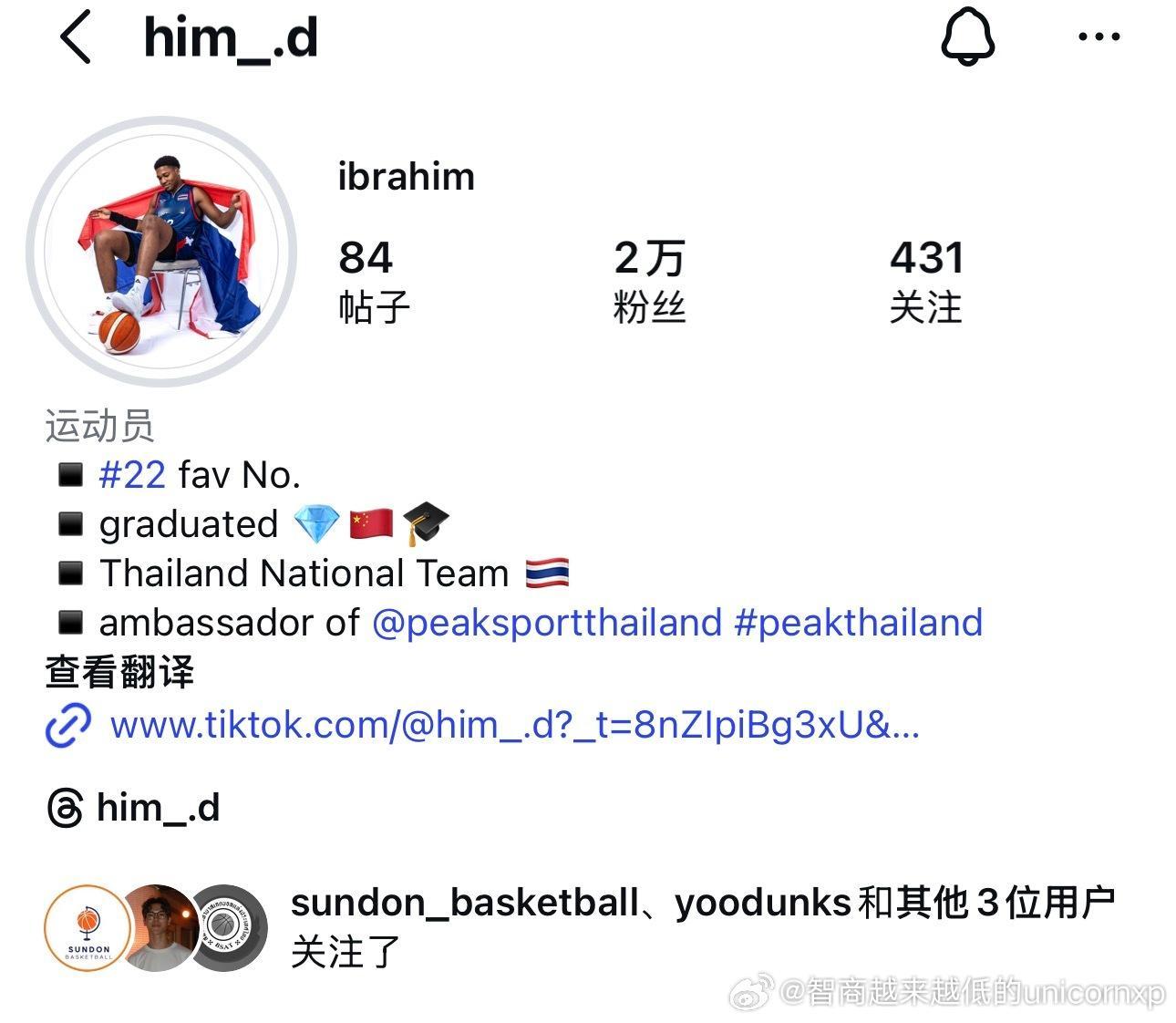 东南亚运动会泰国男篮阵容出现一张新面孔Ibrahim Diaby,出生于2001年,身高198公分,目前效力于泰国联赛CT Tiger,原籍马里,个人ins资料写的是中国大学毕业有人了解的吗亚洲篮球