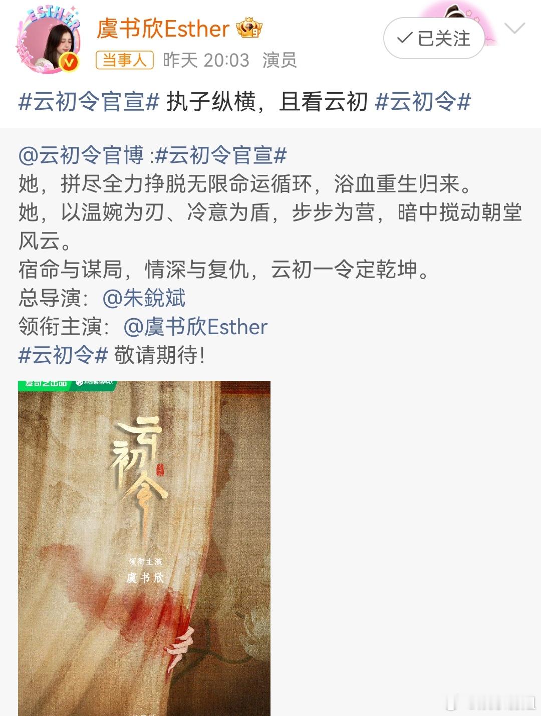虞书欣一天官宣两部剧 剧粉🈶福了咯!就这个欣欣子事业心🈵🈵的!一起来追剧双轨和期待另一部作品云初令 吧!