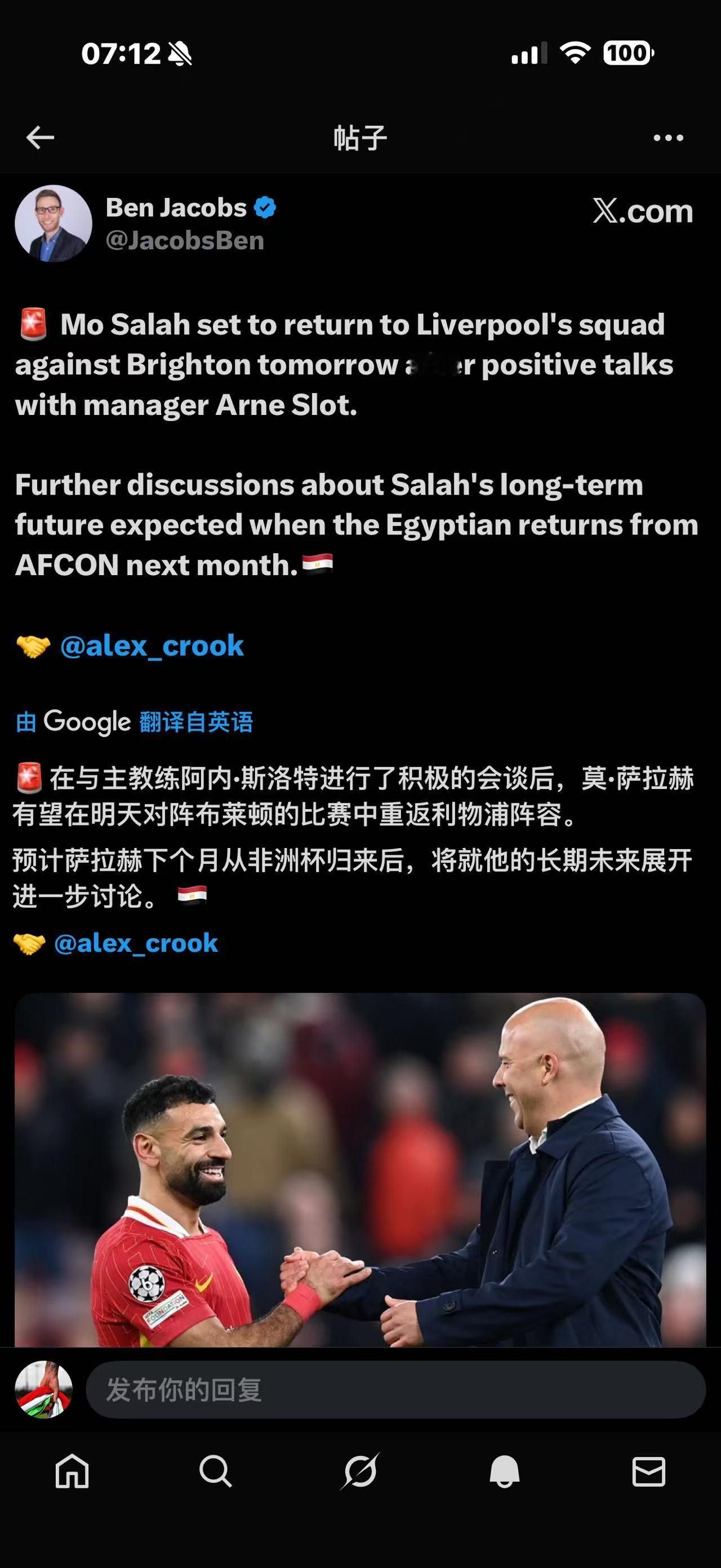 PJ:会谈后,萨拉赫将于今天对阵布莱顿的比赛中,重返利物浦大名单