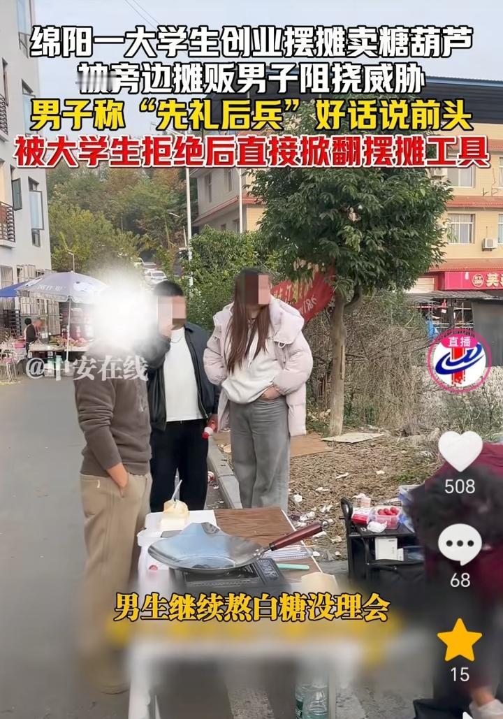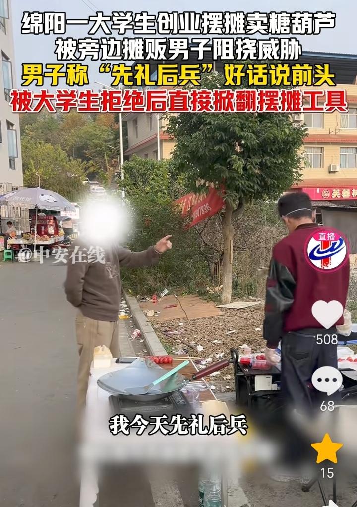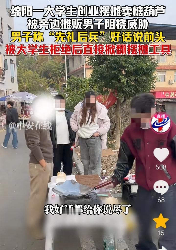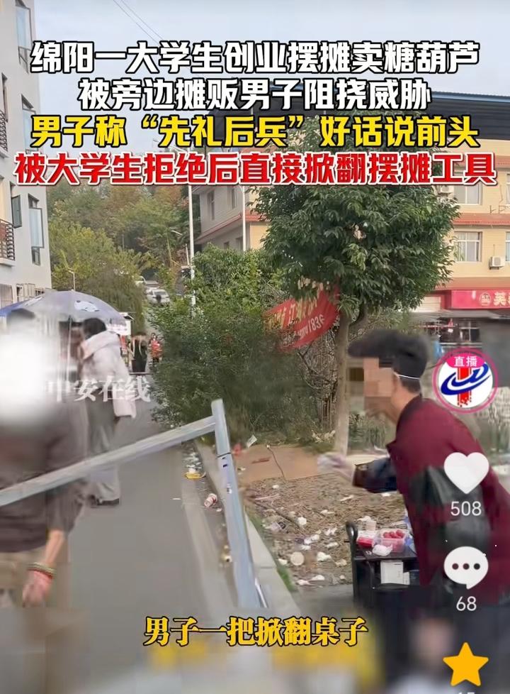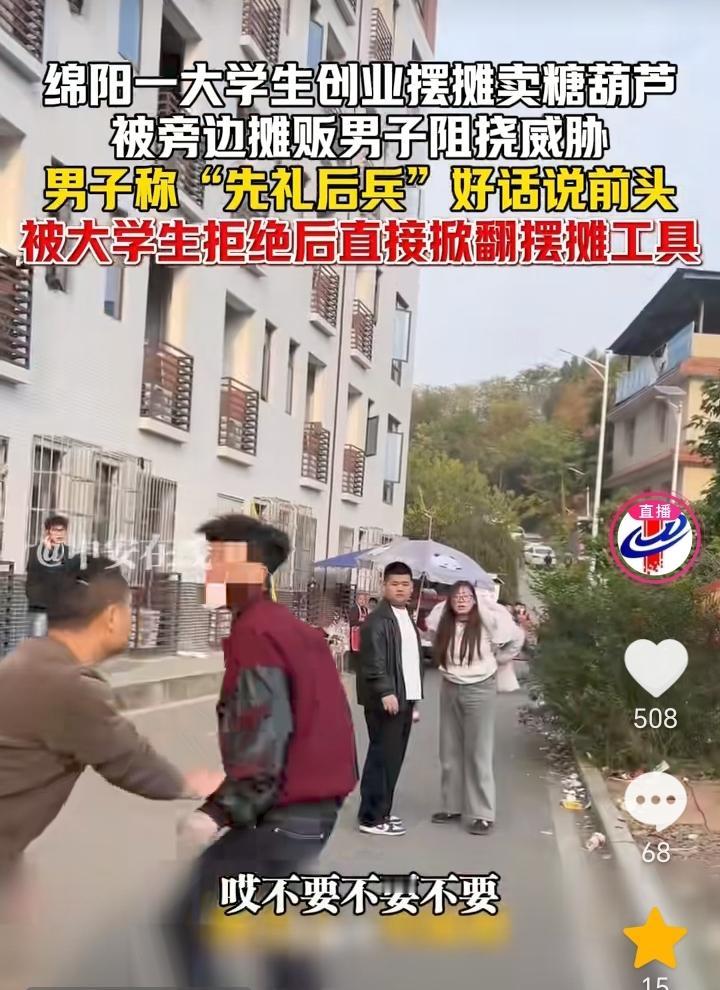 太拽了!四川绵阳,一大学生创业摆摊卖糖葫芦,结果旁边摊贩气势汹汹的找到了大学生让大学生以后不要摆了,并声称自己先礼后兵好话说前头,结果直接被大学生拒绝,看到被拒男子立马恼羞成怒掀翻大学生摊位,大学生气的想要动手,旁边人连忙劝阻。 这男子太拽了,竟然直接不让人家摆摊,大学生创业摆摊也是不容易,没想到被男子给上了一课,不过这件事也是告诉了大学生人心险恶。 遇到这种情况大学生应该直接选择报警严惩男子,现在是法治社会一切都要讲规矩,并不是靠着恶和狠。 不怕事但是也不要去惹事,遵纪守法做一个合格的公民。