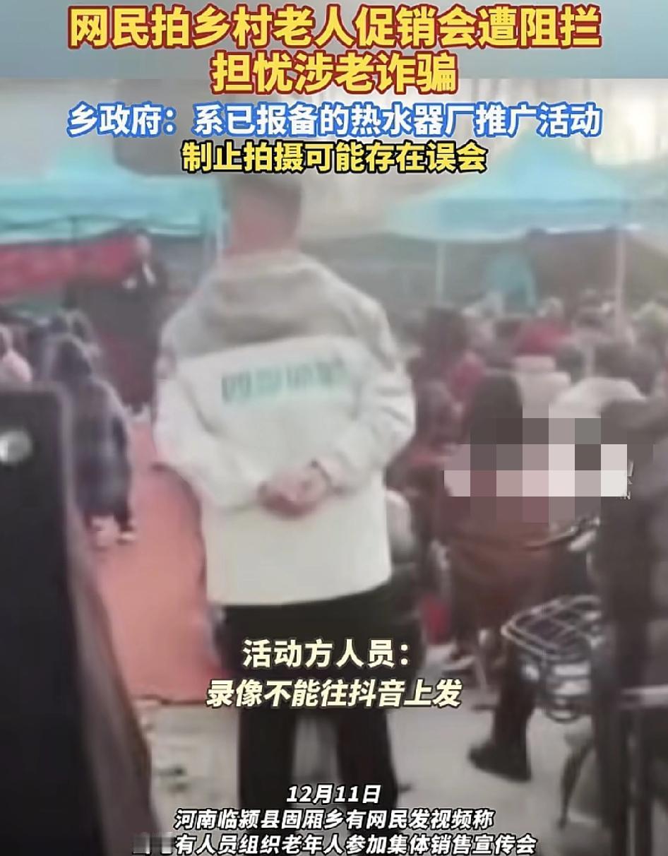 河南临颍县一村庄组织老年人参加集体销售宣传会,有在现场拍摄时被工作人员阻拦,质疑是否存在着老年人传销活动。不过当地政府已经回应这是已经报备过的热水器厂在搞推广活动,禁止拍摄可能是沟通之间存在着误会,被问到为什么现场全都是老年人?村里的网格员表示现在村里基本上没有年轻人。至于年关谨防诈骗,他们表示时常都在给老年人做相关的知识推广。
