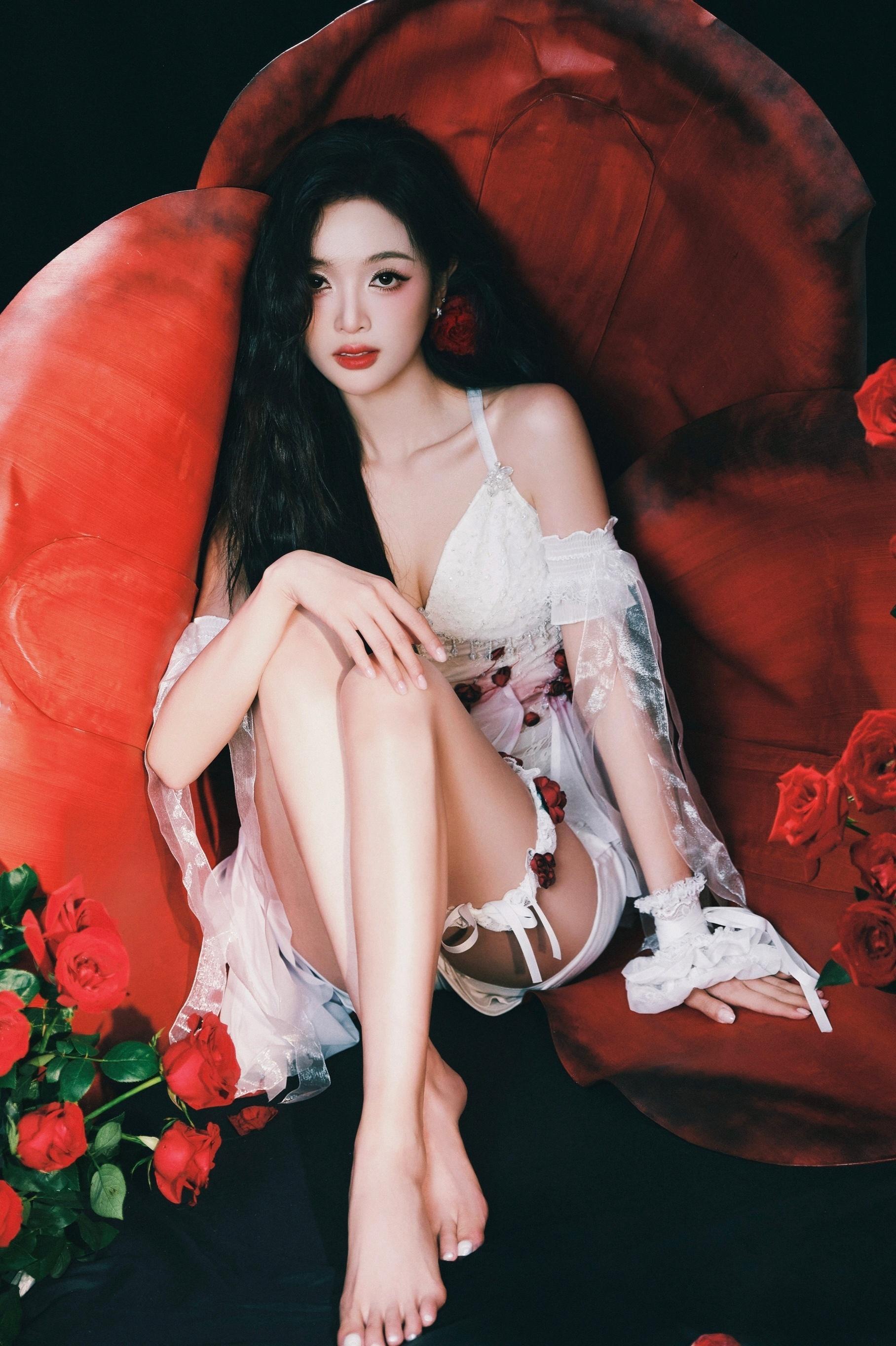 《秋光裹身的绯暖》深棕长发垂在秋的底色里,她身上的绯红像妥帖的晚霞,落进柔