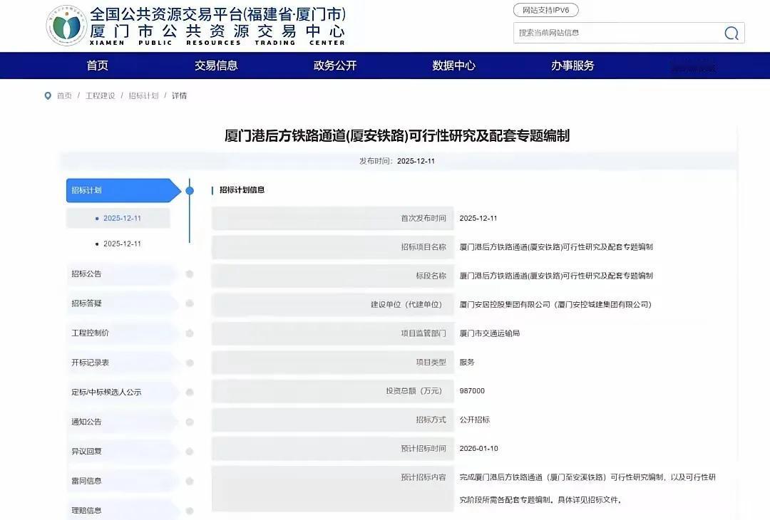 总投资98.7亿元的厦安铁路明年元月可行性研究及配套专题编制将进行招标 2026年1月10日厦安铁路可行性研究及配套专题编制将进行招标。厦安铁路北起兴泉铁路安溪东站,途经南安英都、同安区中心,穿越厦门城市建成区后终至厦门枢纽前场站,正线全长67.6公里,并设上行联络线7.96公里、下行联络线9.67公里。项目总投资额为987000万元,由厦门安居控股集团有限公司牵头建设。
