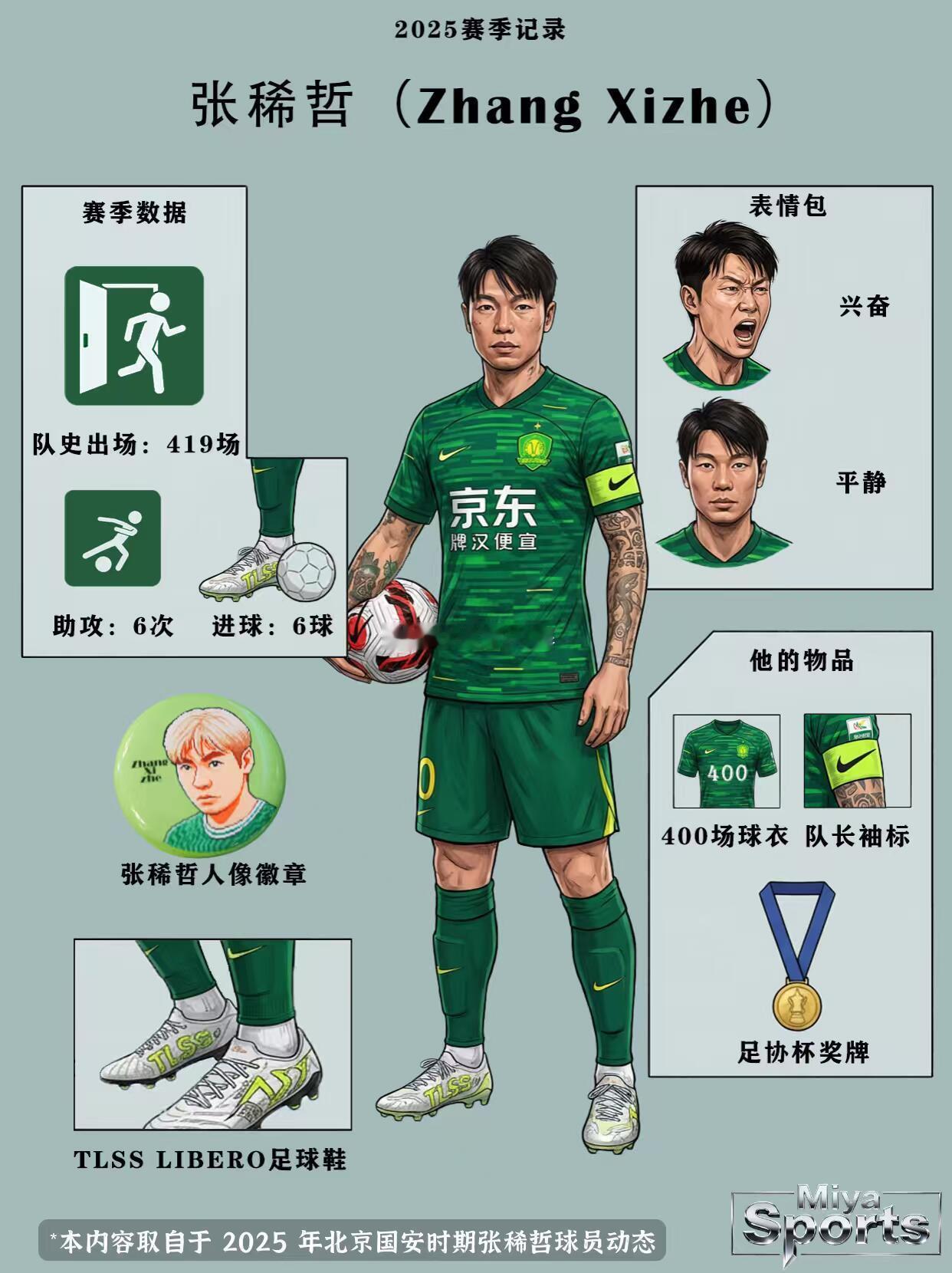 北京国安北京国安 国安队史第二419场!张稀哲是北京的“中场本赛季张稀哲这赛季又刷新队史出场——419场,直接稳坐国安队史第二!这绿衣一穿,就是10年以上的“中场活化石”🤯这赛季的他还是那味儿:6球+6助,既能贴地斩轰门,又能给队友喂到饱!队史出场数往上堆的不是数字,是他在工体跑过的每一寸草皮啊🌿🤭场下的他更戳:纹身裹着国安魂,进球后要么兴奋到喊破音,要么冷静得像刚喝完茶;连装备都藏细节——400场纪念球衣、队长袖标往那儿一摆,全是和球迷的双向奔赴~国安球迷们说,张稀哲🔥这“队史级中场”,是不是国安球迷的“青春锚点”?……Miya Sports