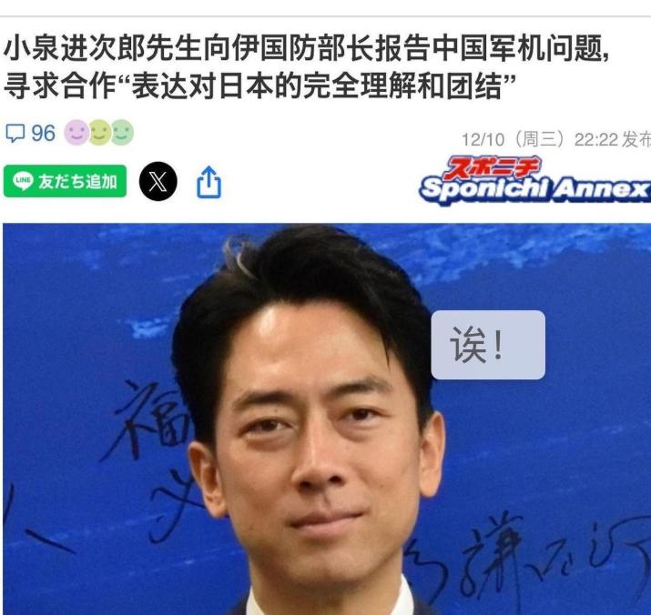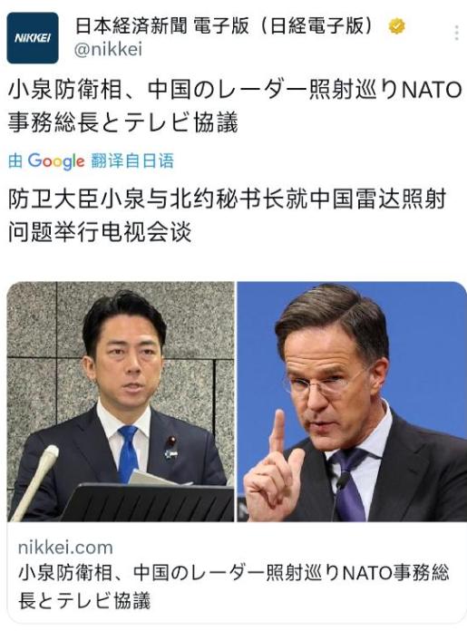 日本防卫大臣小泉进次郎像个乞丐一样,向西方国家挨家挨户告中国的状。 德国大使见面了。 意大利防长打电话了。 北约秘书长电视会谈了。 美国防长通话了。 当年二战的老搭档又凑一起了。 内容就一个,中国用雷达照我了,欺负我了,爸爸们赶快来帮我! 日本这个国家,从来没有好心,来试试吧,中国等一个机会很久了。