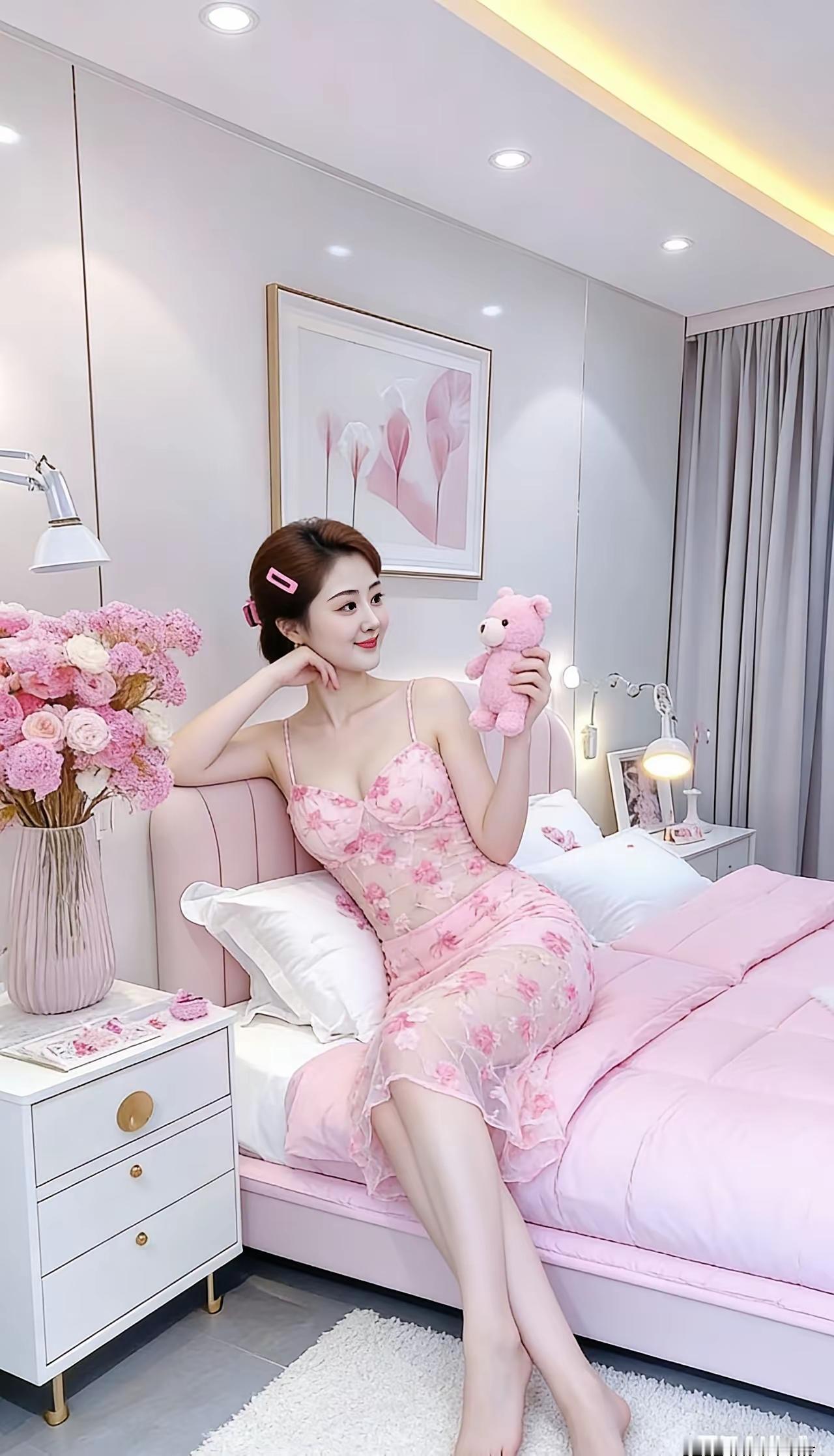 粉嫩卧室,少女心爆棚,粉色睡衣与毛绒玩具,温馨甜美