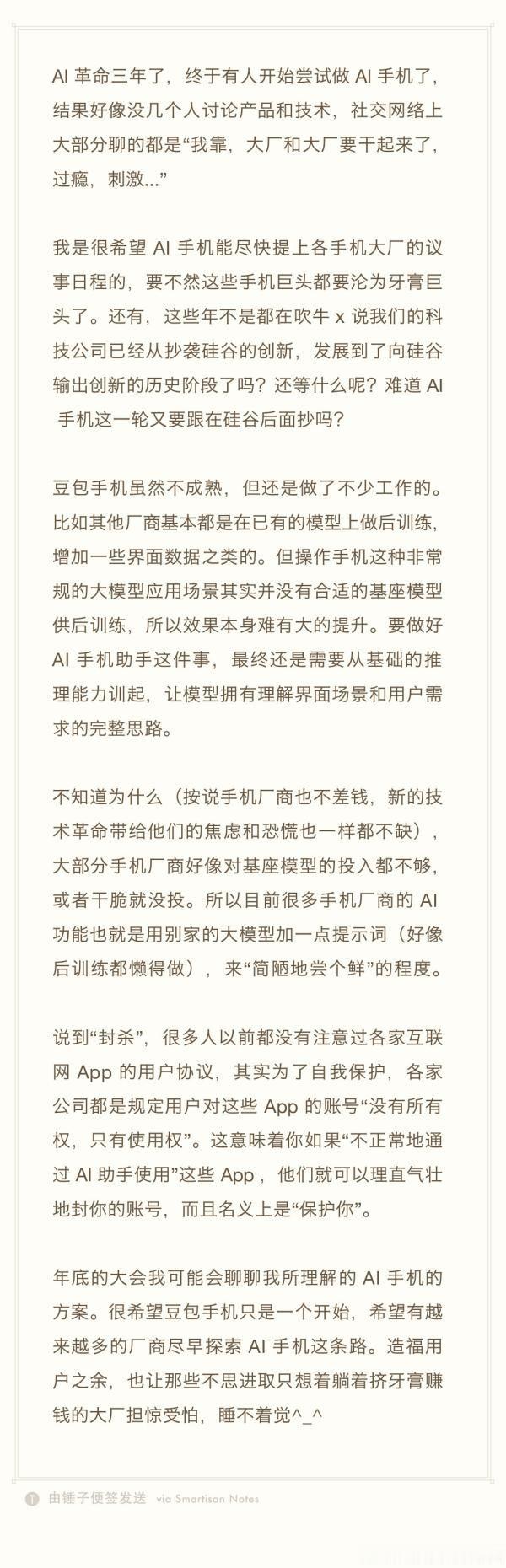 罗永浩说AI手机让躺着赚钱的大厂睡不着觉这话是在说谁呢?华为、小米、OPPO、vivo也没有躺着赚钱的要真说躺着赚钱的,当年的锤子手机绝对首屈一指,不过锤子真算不上大厂~