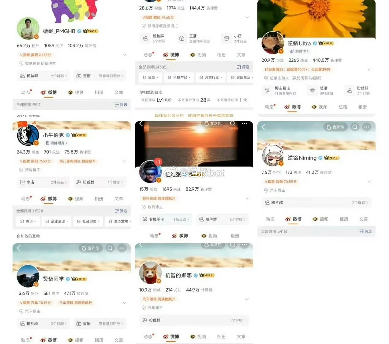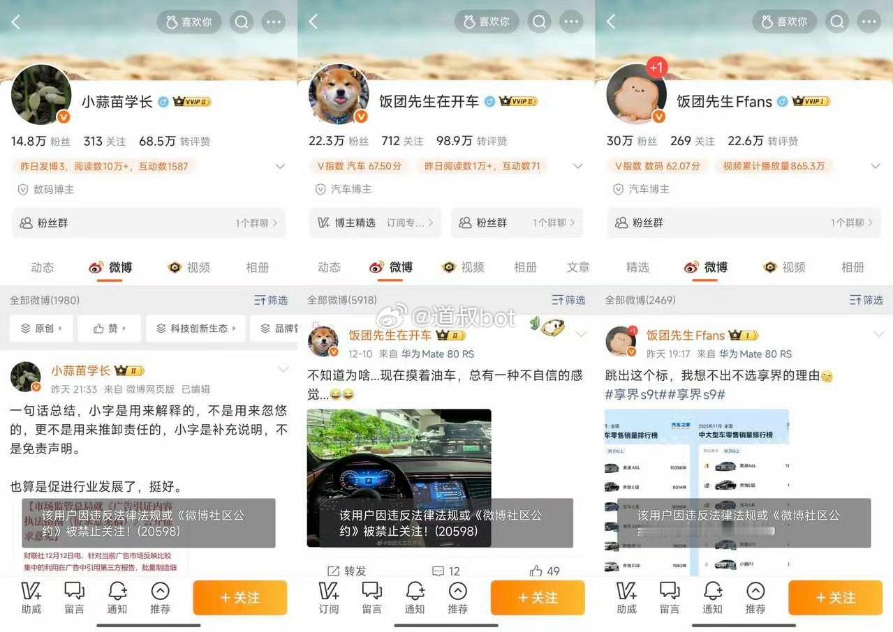 微博又封禁了一批账号,CCTV法治在线连发数条博文起底黑公关,据不完全统计的名单:益达张 逆鳞Ultra 周天在路上_ 小牛德克 逆铭Niming机智的娜娜 缥缈_PMGHB 南瓜酥 番茄殿下虫数码贤备同学捌拾贰號Amor_叶叶叶李子墨Kimi路诞先生阿笨(11AMYLIU)胖哥杨力大象主观说车1024专员Navis-慢点评测水水兄同学小蒜苗学长饭团先生Ffans饭团先生在开车邹总买电车啦酋知鱼ArthurShen_Origin 崔啸-大管家东岸村Niko张哲学Lab西风落日无语电车尼克小黑夜之睛还有补充吗?