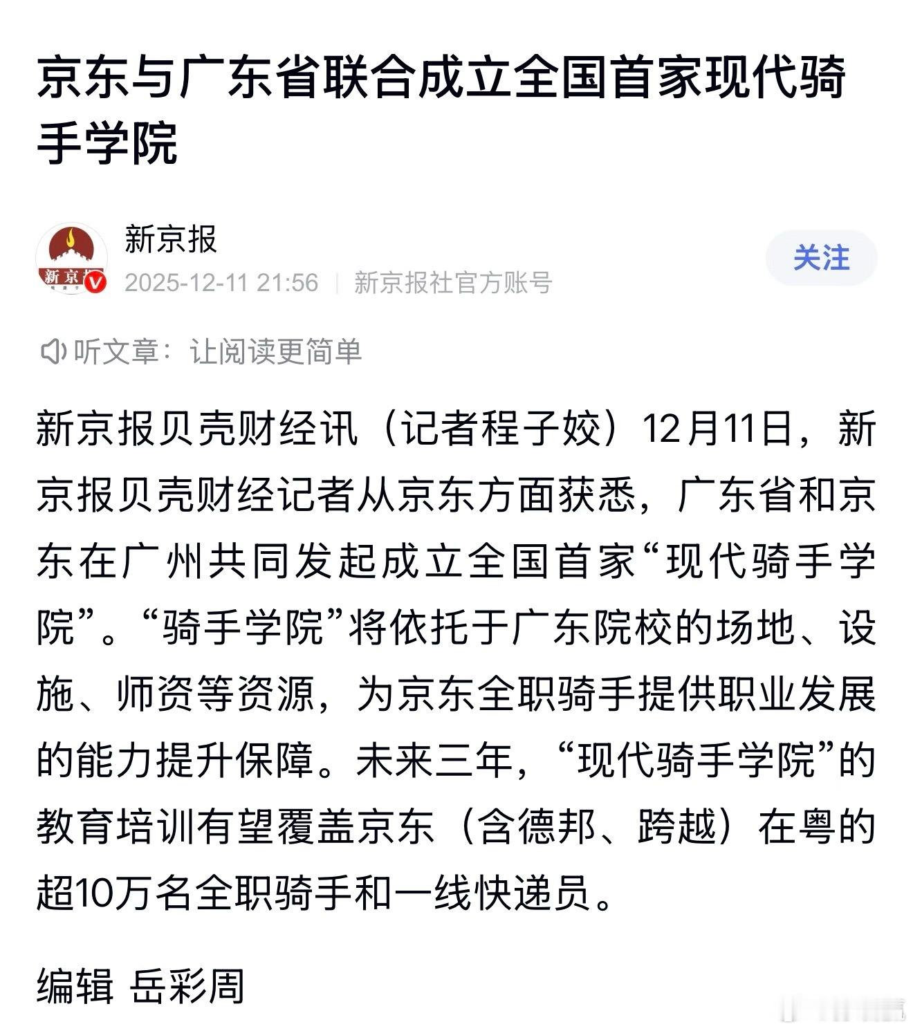 京东与广东联合成立首家现代骑手学院。以后骑手也要看学历了吗