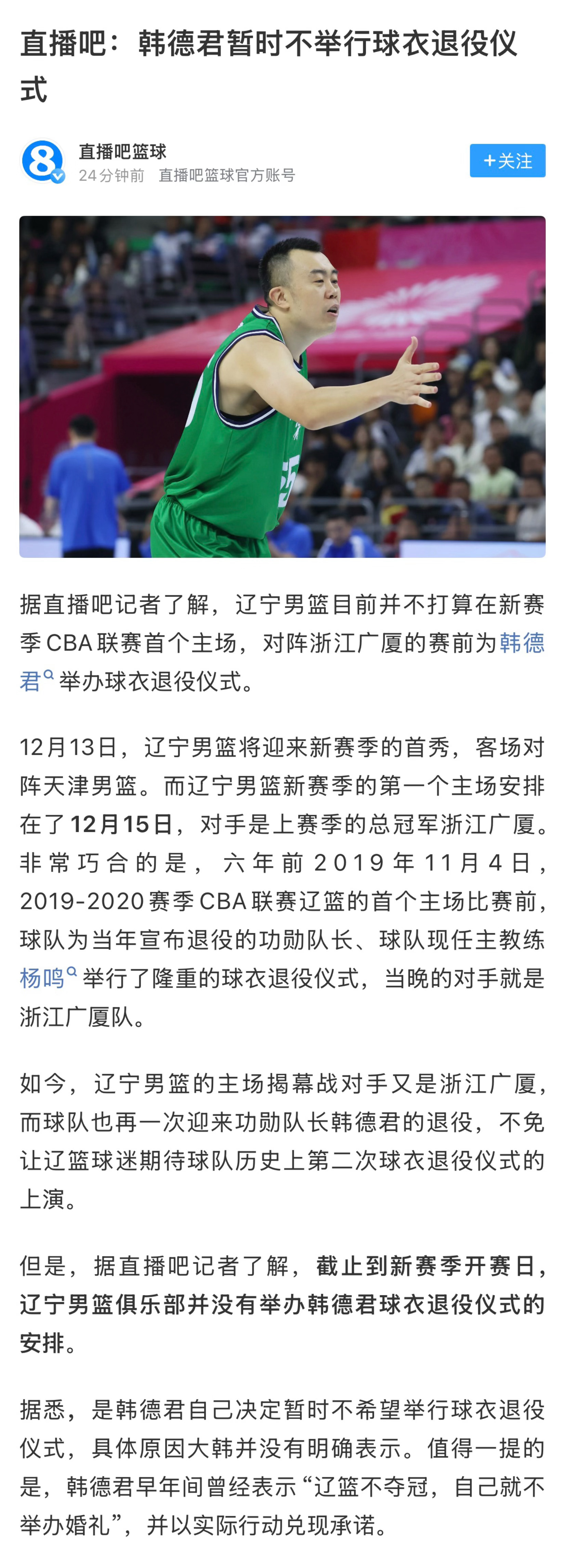 直播吧报道,已经退役的辽宁男篮前队长韩德君,暂不举行球衣退役仪式。但这也就是时间