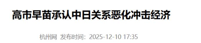 中国没想到,俄罗斯也没想到!2025年12月12日报道,高市早苗承认中日关系恶化冲击经济!   作为日本现任首相的高市早苗是一位右翼分子,所以在其就职之后,迫不及待的就把手伸到了我国的内政问题中。在发表错误的涉台言论后,中日两国争端不断的激化。   我国采取了一些实际行动,去进行反击。我国相关部门出于对公民的人身安全考虑,发布了多则提醒。很多近期有旅日行程的中国公民,选择取消了行程计划,直接给日本的旅游经济带来了冲击。   除此之外,刚刚恢复进口的水产品就被暂停。这个情况,就给日本的渔民带来了经济影响。但在这个背景下,日方仍旧执迷不悟。可是随着时间的推移,日方却不得不承认,中国真的给日本造成了影响。   根据媒体2025年12月12日的报道,高市早苗终于承认中日关系恶化,冲击了经济。此事立即引起国际高度关注,高市早苗在对此承认的时候更表态,将关注中方一系列措施造成的影响等有关情况,并妥善应对。   其实就当下来说有一个最简单,且及时能够看到效果的方式。那就是就此事进行悔改,就历史战争进行反思。   但从当下的日本态度来看,想要让日本有所悔改,还需要有些时日。因为当下的日本,正试图在国际中炒作“中国威胁”,试图给中国泼脏水。   但日方却忽略了,日本的野心早已经暴露。当下国际多个国家都已经支持中国,日本已经陷入了孤立无援的阶段。   对此,您怎么看? (信息来源:高市早苗承认中日关系恶化冲击经济-杭州网)