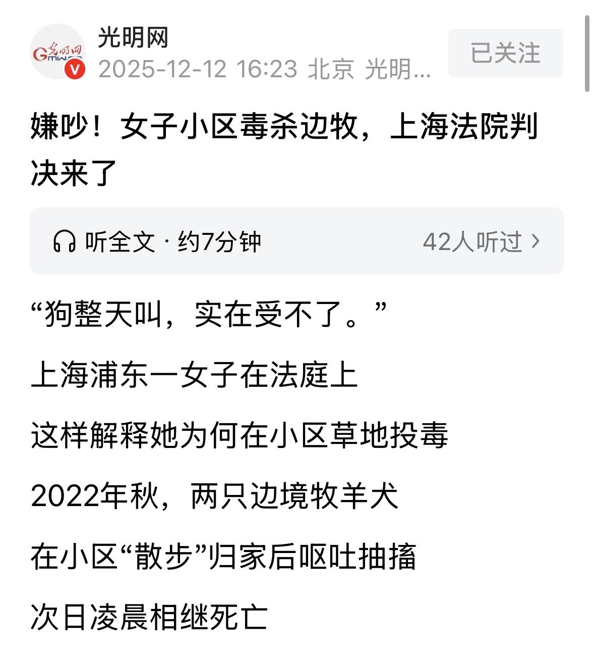 上海,女子嫌小区里总有人散养狗,任由它们四处乱跑,还不分昼夜地吠叫,女子被吵得不堪其扰,就把毒药撒在小区草坪里,没想到,2条边牧在遛弯时中招,当晚就中毒死亡了,2名狗主失去爱犬后悲痛万分,分别诉至法院,双双索赔爱犬购买费、抢救费、火化费、精神损害费等2万余元,加起来投毒者得赔5万多,法院判决出乎意料。 2022年的一个傍晚,居民李某和侯某像往常一样,牵着自家养的边境牧羊犬在小区便道上遛弯。 两只狗毛色漂亮,精神头十足,是主人眼里的宝贝疙瘩。 然而,悲剧很快就发生了。 遛完狗回家没多久,两只原本活蹦乱跳的狗狗,都突然不对劲了。它们出现同一种症状,那就是开始控制不住地剧烈呕吐,身体还不停地抽搐、发抖。 这可把两位主人吓坏了。李某和侯某心急火燎,赶紧抱起狗就往宠物医院冲去。 经诊断,两条狗都中毒了,还很严重,最终还是没能救回来,在第二天凌晨,先后断了气。 事后回忆起那个晚上,侯某依然悲痛万分,说一切都太突然了,好好的狗就出门遛了那么一圈,回来就没了,当时感觉心都给掏空了。 家里宝贝宠物不明不白死了,这肯定不行,两位主人直接报了警。警察来了以后,仔细查看了小区的监控录像。 这一看,真相浮出水面:就在10月1号那天傍晚6点多,同一个小区里住着的住户彭某,悄悄摸摸地走到69号楼下面的那片草地上,然后从身上掏出了一些小颗粒的东西,撒在了草丛里。 后来,警方从两条狗狗胃里取出吃进去的东西,还有从那片草地上捡回来的食物残渣。 根据化验结果,警方检测出了一种叫“氟乙酸”的有毒物质。 这东西可不是闹着玩的,它毒性极强,常常被用来做老鼠药,而且国内早就明令禁止生产和使用这种玩意儿了。 面对警察的询问和后来的指控,彭某承认了,草地上的东西确实是她撒的。但她解释说,自己真不是特意要害死李某和侯某这两条狗的。 小区里总有那么些狗,主人也不好好管,整天就那么散放着,不分白天黑夜地狂叫,还动不动就乱跑乱窜。 彭某觉得这严重影响了她的日常生活,她根本休息不好。 她跟狗主人提过,没啥用,就想着弄点带毒的东西撒那儿,主要是想吓唬吓唬这些狗,让它们别老往那块儿凑,离她家远点,真没料到会把狗给毒死。 尽管彭某这么说,但她的这个解释,后来在法院那儿并没有被采纳。 2024年6月,李某先一步把彭某告到了法院,到了2025年5月,侯某也跟着提起了诉讼。 两位狗主人要求彭某赔偿两方面的损失:一个是他们的财产损失,另一个则是狗狗死了带来的精神上的痛苦。 在法庭上,李某拿出当初买狗的协议、带狗去抢救的花费单子、给狗做解剖和火化的费用单据等等。 他一笔一笔算账:当初买这狗花了8500块,抢救费1095元,验尸加火化又花了1100元。 除了这些,他觉得狗狗的死让她精神上受了很大打击,所以还要1万块的精神损失费。 另外,请律师打官司花了8333元,她也觉得该由彭某承担。这么一加,总共要彭某赔29028元。 侯某那边也类似,他索赔的款项有:买狗钱3500元,抢救费960元,火化费1050元,精神损害抚慰金1万元,律师费同样8333元,加在一起是23843元。 彭某坐在被告席上,对这些赔偿要求提出了异议。她承认有责任,但觉得对方要的精神损失费1万块太高了。 至于律师费,她更是不认账,说他们自己要请律师的,凭什么让我掏这个钱? 那么,从法律角度,怎么看待这件事? 《民法典》第1165条第1款规定:行为人因过错侵害他人民事权益造成损害的,应当承担侵权责任。 法官审理认为,案子关键点在于:彭某在小区公共区域的草地上撒剧毒物质,这个行为本身就有问题。 她明明知道那东西毒得很,还故意撒在那儿,不管她本意是不是真要毒死特定的狗,这就构成了法律上的“过错”。 而且,这个行为直接导致了李某和侯某的两条狗中毒死亡,造成了实际的损害结果。 所以,彭某必须承担侵权责任。 最后,法院作出了判决:彭某需要赔偿李某11695元。这笔钱里头,包含了1000元的精神损害抚慰金。 彭某需要赔偿侯某6510元。这笔钱里,同样包含了1000元的精神损害抚慰金。 至于两位原告都提出的律师费赔偿要求,法院没支持。 法官解释,因为现行的法律里面,没有明确的规定说这种情况一定要被告承担对方的律师费。 为什么支持精神损害赔偿?法官说,现在社会不一样了,宠物对很多人来说,早就超越了简单的财产概念,更像是生活中的伙伴、家人,是情感的寄托。朝夕相处,感情很深。 这样的伴侣动物突然死了,尤其是非正常死亡,的确会给主人带来实实在在的精神上的痛苦和打击。 对此,你怎么看? 关注@运良说法. 学法律知识不迷路