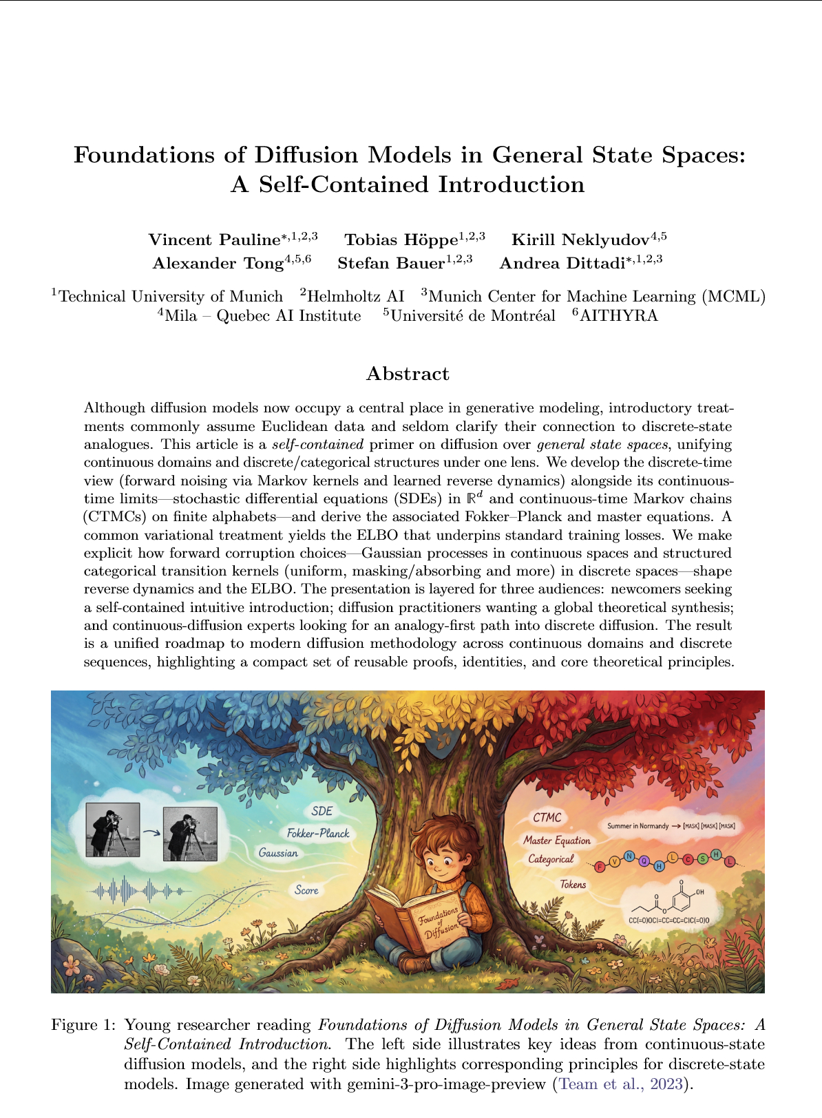 如果你正在研究生成式 AI,你可能已经熟悉了用于画图的 Stable Diffusion(基于连续空间)。但当你面对文本生成、DNA 序列设计或任何离散数据任务时,是否感到现有的连续扩散理论有些“水土不服”?或者,你是否一直在寻找一个统一的数学视角,能同时解释图像的去噪过程和文本的掩码生成?arxiv.org/abs/2512.05092这篇题为《一般状态空间扩散模型基础:自包含导论》的教程,正是为你准备的指南。