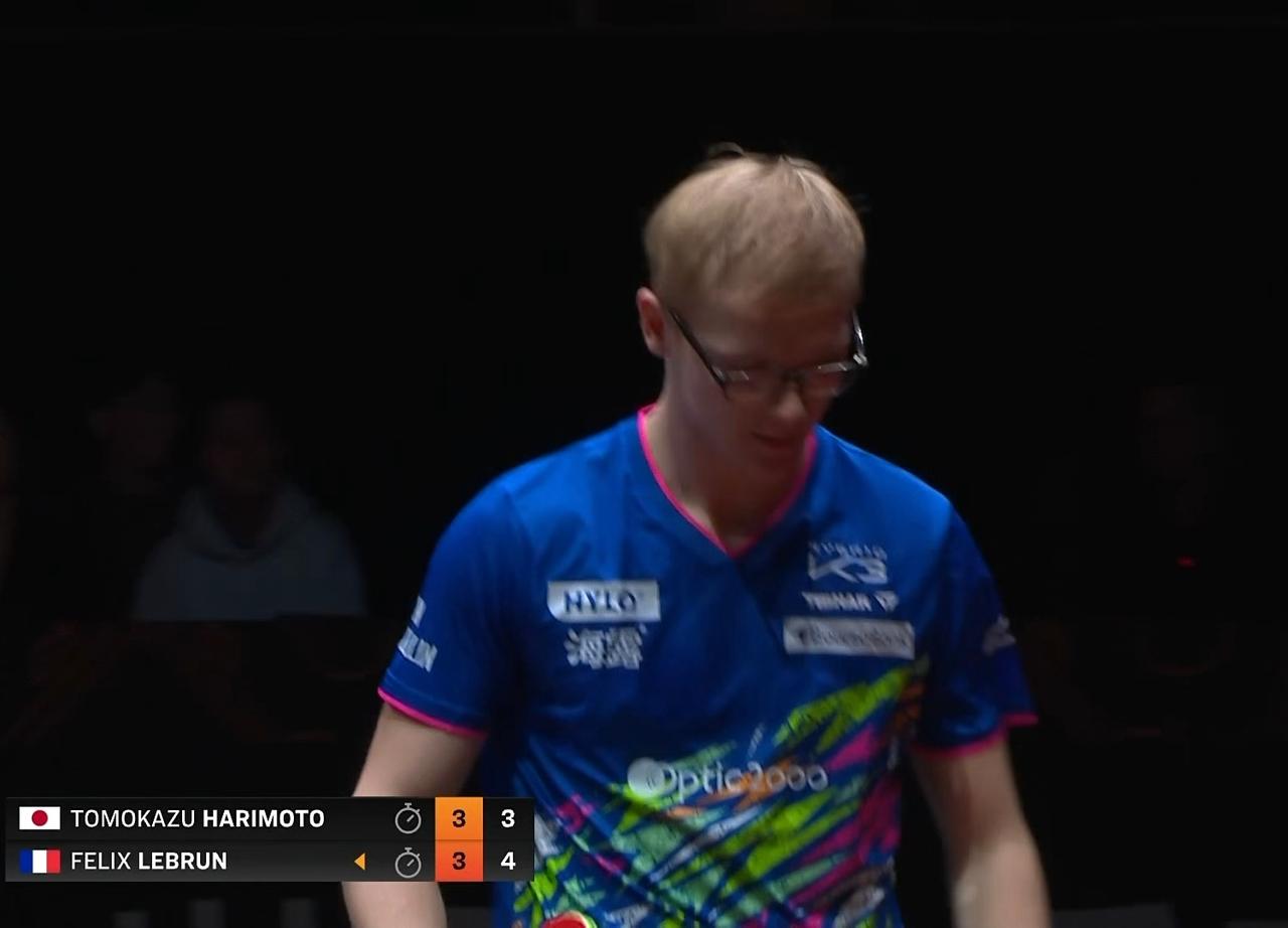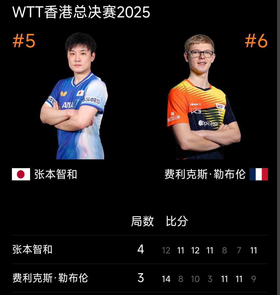 张本智和4-3险胜小勒布伦晋级四强! WTT香港总决赛2025 男单四分之一决赛,日本主力张本智和与法国主力菲利克斯.勒布伦激战七局,最终以总比分4比3胜出,晋级四强! 本场比赛跌宕起伏,首局张本智和以12-14输掉之后,加强了正反手进攻质量,连胜三局,大比分3比1领先,就在以为张本智和将会很快获胜时,菲利克斯.勒布伦奋起直追,连赢两局将比赛拖入决胜局,比赛在最后一刻才揭晓悬念。决胜局张本智和把握住了机会,以11-9拿下胜利! 张本智和 半决赛对阵向鹏与林诗栋之间的胜者。