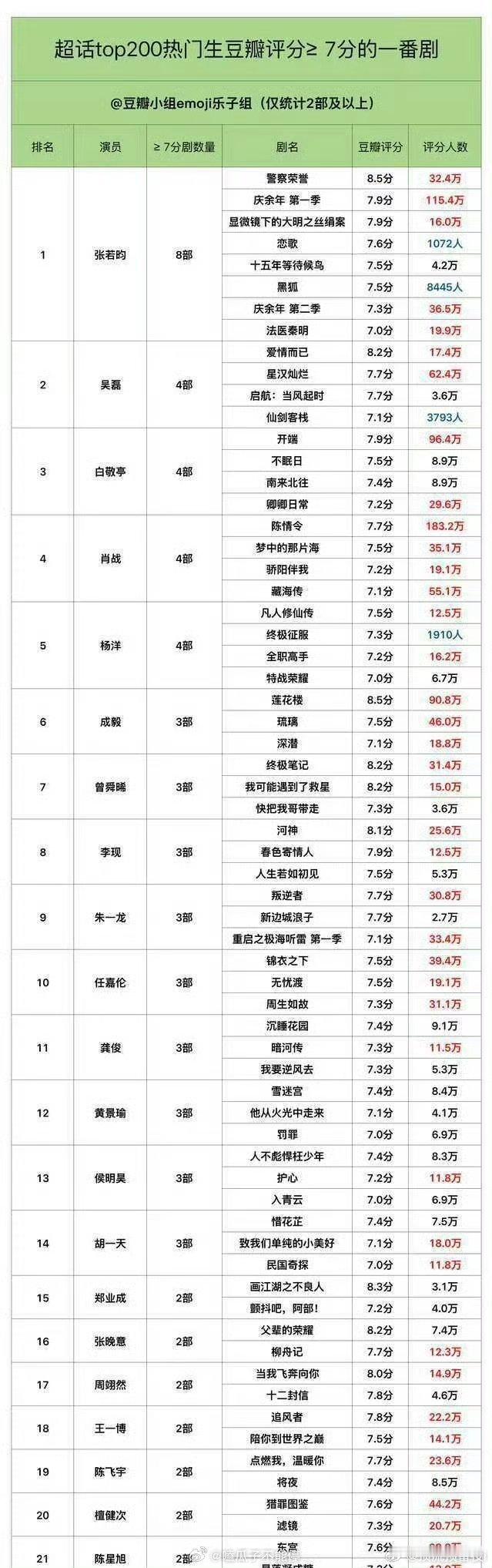 超话top200热门生花豆瓣评分≥7分的一番剧拉表🥜前三:张若昀,吴磊,白敬亭